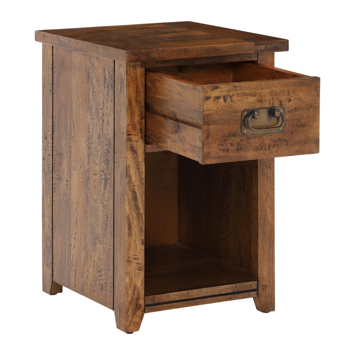 Design. A handy compact bedside that is perfect for a compact space. The New Frontier Mango Wood 1 Drawer Bedside is a great addition to any bedroom, and offers a rustic feel that to bring an eclectic look to your home. Dainty pully handles placed onto metal backs make these drawers an easy functioning storage solution. This item is part of the Trees 4 Trees project. Read more. Here.