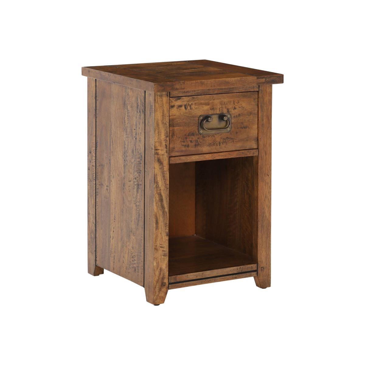 Design. A handy compact bedside that is perfect for a compact space. The New Frontier Mango Wood 1 Drawer Bedside is a great addition to any bedroom, and offers a rustic feel that to bring an eclectic look to your home. Dainty pully handles placed onto metal backs make these drawers an easy functioning storage solution. This item is part of the Trees 4 Trees project. Read more. Here.