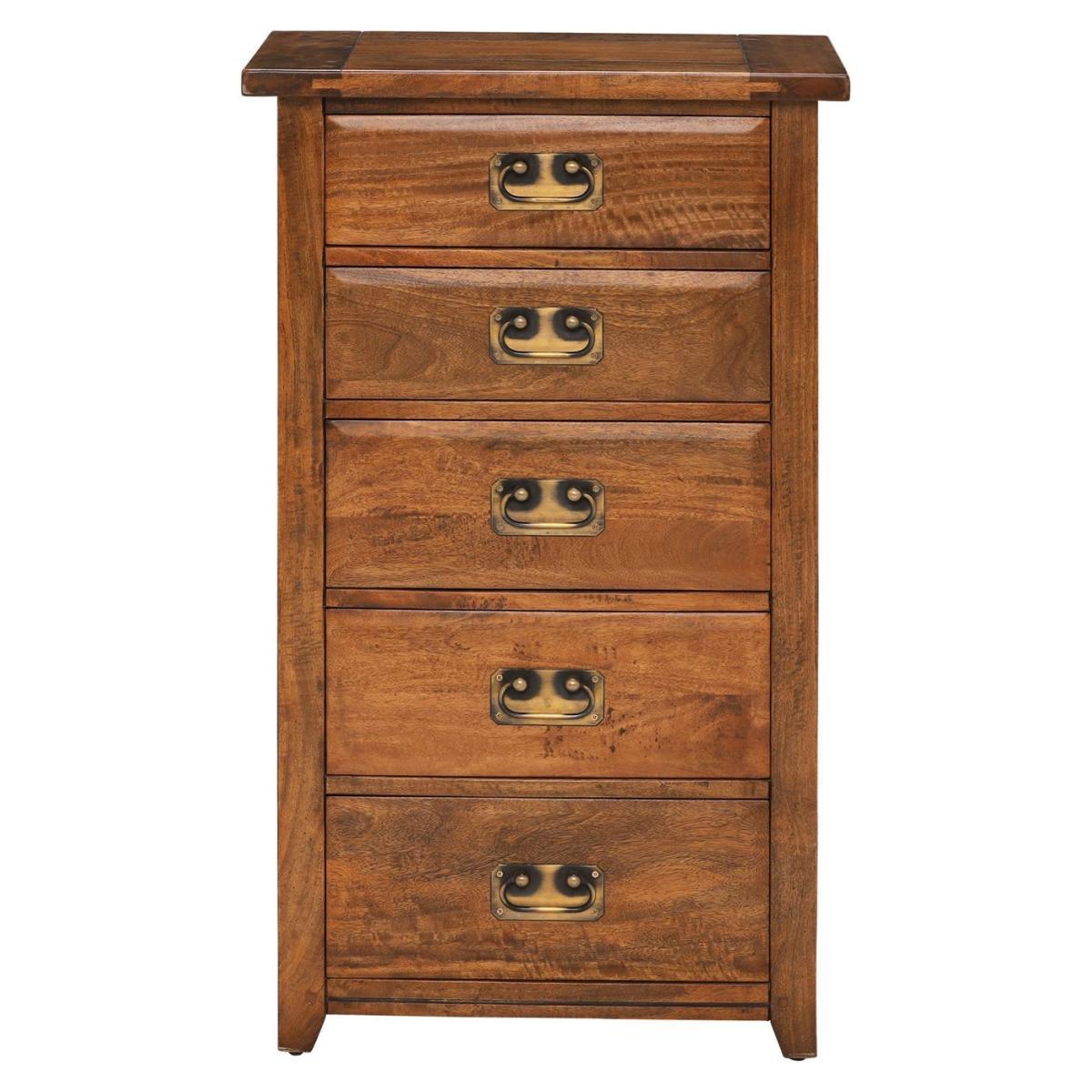 Design. This characterful Chest of Drawers (5 drawers) is part of the new Frontier Bedroom Collection and is made from mango wood which has a warm and mellow tone. The 5 Drawer Chest has been given a cleverly distressed finish which gives it an essentially rustic feel with the clean lines and simple detailing giving the furniture piece it a contemporary feel. The gentle faceting on the five drawers and the stylish brass handles add character to the chest that suits both traditional and more modern settings. There is also a 3 drawer chest in this contemporary bedroom collection - the range highly versatile and the ideal addition to any bedroom. This item is part of the Trees 4 Trees project. Read more. Here.