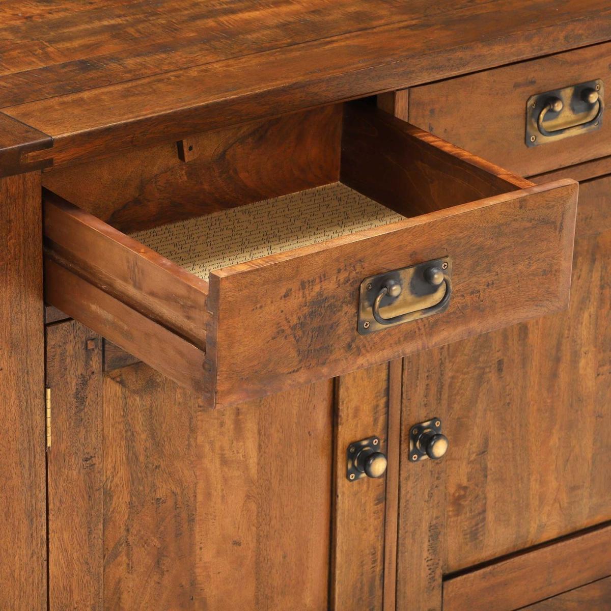 Design. This rustic narrow Sideboard is made from mango wood which gives the pieces a warm and mellow tone. This stylish Sideboard has been given a cleverly distressed finish which gives this design an essentially rustic feel. With clean lines and simple detailing, the new Frontier Dining range has a stylish and contemporary feel. There is gentle faceting on the drawers and the door fronts of the elegant sideboard, with rustic brass handles which adds character to a range that suits both traditional and more modern settings. This item is part of the Trees 4 Trees project. Read more. Here.