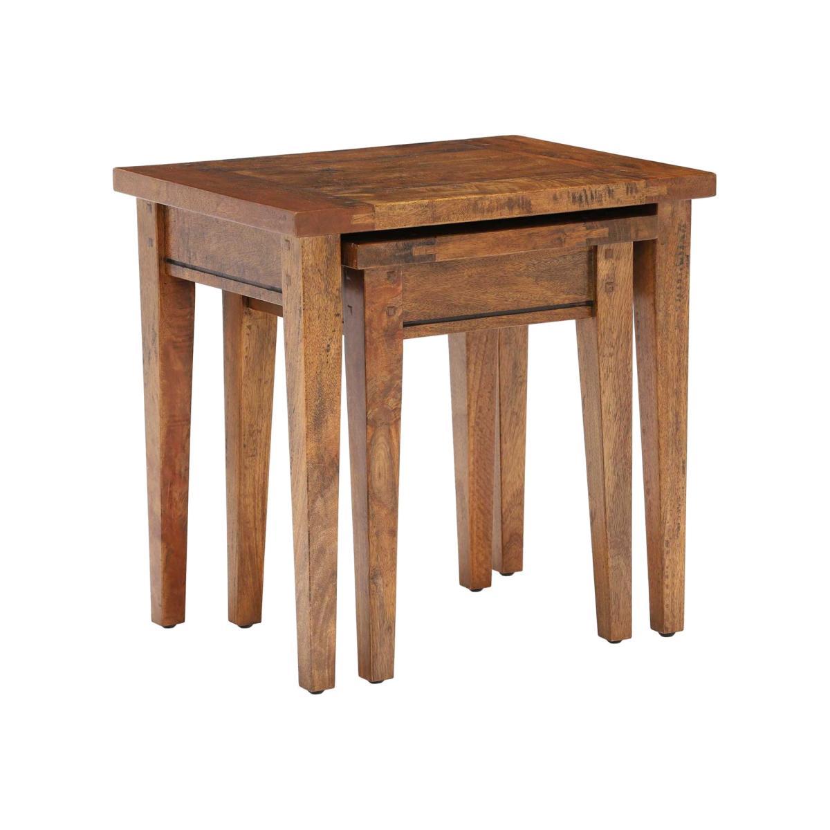 Design. This rustic Nest of Tables is made from mango wood which gives the piece a warm and mellow tone. These stylish occasional tables have been given a cleverly distressed finish which gives this design an essentially rustic feel. With clean lines and simple detailing, the new Frontier Living Room furniture range has a stylish and contemporary feel. The graceful elegance of this nest of tables enhances the look of any room as it creates a focal point which is perfect for entertaining family and friends. Also available in the new Frontier range are Coffee Tables, lamp tables and console tables. This item is part of the Trees 4 Trees project. Read more here.