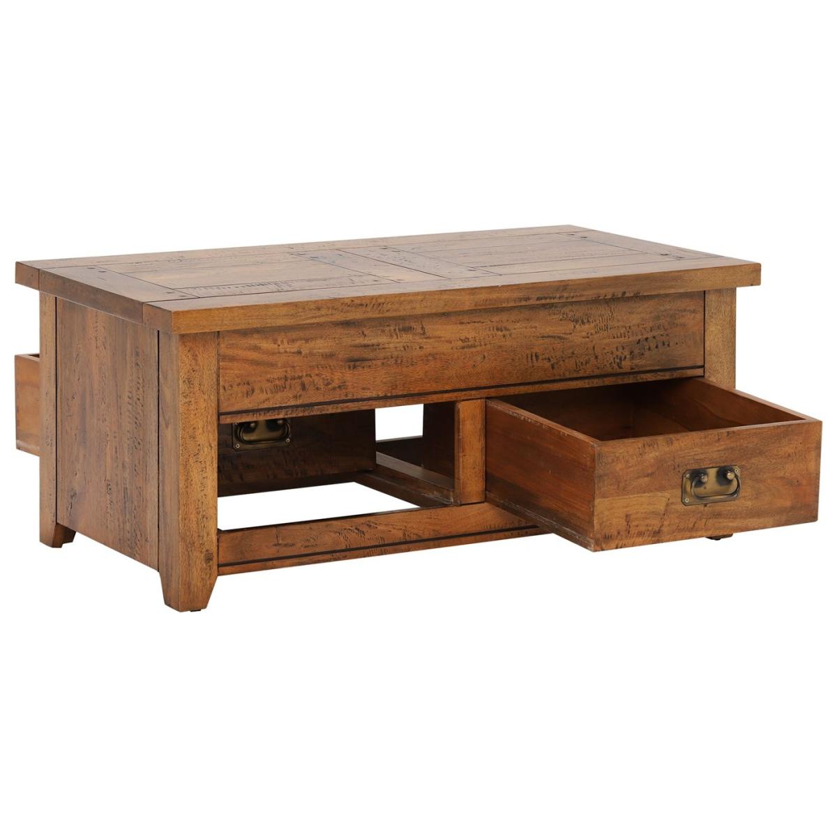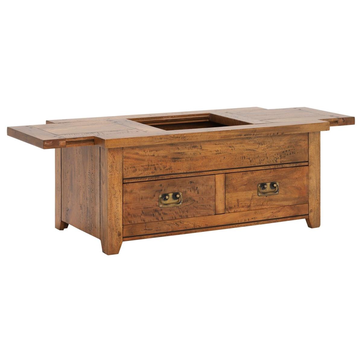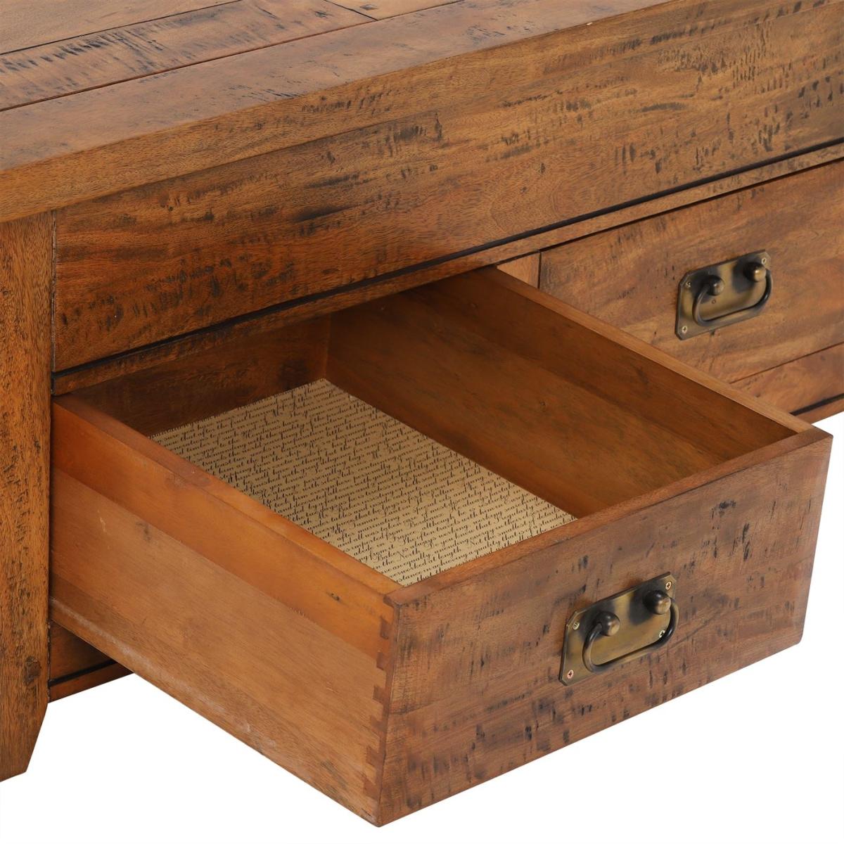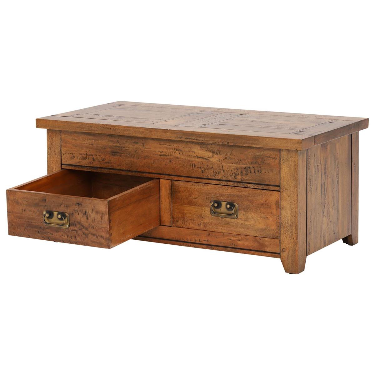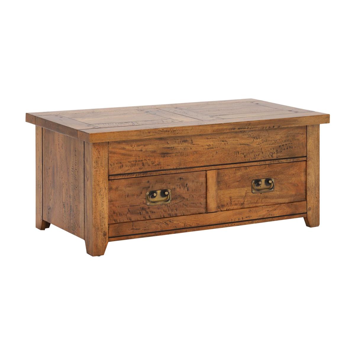 Design. This rustic Coffee table with drawers is made from mango wood which gives the piece a warm and mellow tone. This stylish occasional table has been given a cleverly distressed finish which gives this design an essentially rustic feel. With clean lines and simple detailing, the new Frontier Living Room range has a stylish and contemporary feel. The graceful elegance of this coffee table enhances the look of any room as it creates a focal point which is perfect for entertaining family and friends. Also available in the new Frontier range are Coffee Tables, lamp tables and console tables. This item is part of the Trees 4 Trees project. Read more here.