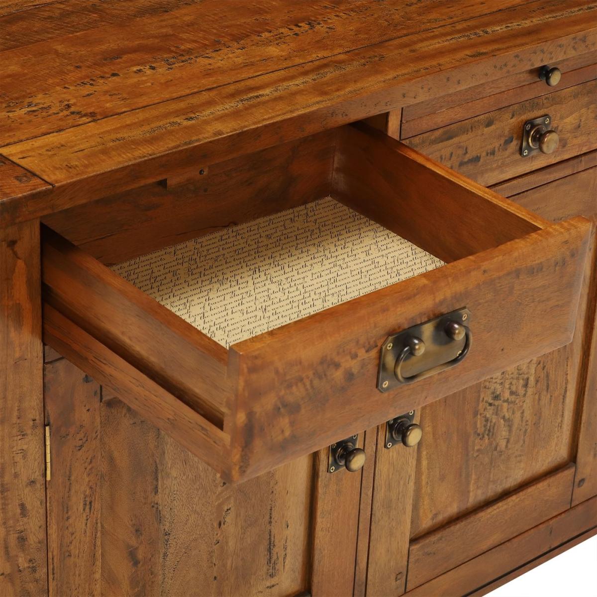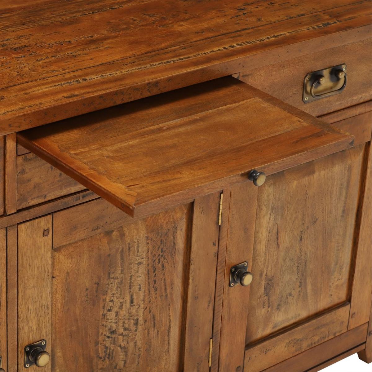 Design. This rustic wide Sideboard is made from mango wood which gives the pieces a warm and mellow tone. This stylish Sideboard has been given a cleverly distressed finish which gives this design an essentially rustic feel. With clean lines and simple detailing, the new Frontier Dining range has a stylish and contemporary feel. There is gentle faceting on the drawers and the door fronts of the elegant sideboard, with rustic brass handles which adds character to a range that suits both traditional and more modern settings. This item is part of the Trees 4 Trees project. Read more. Here.