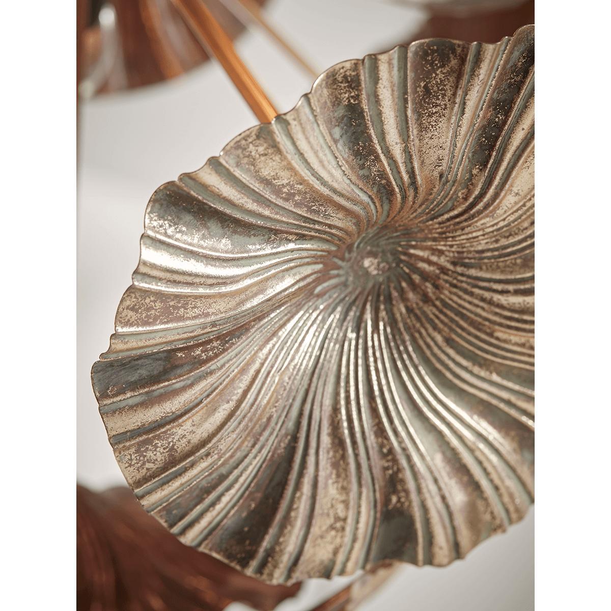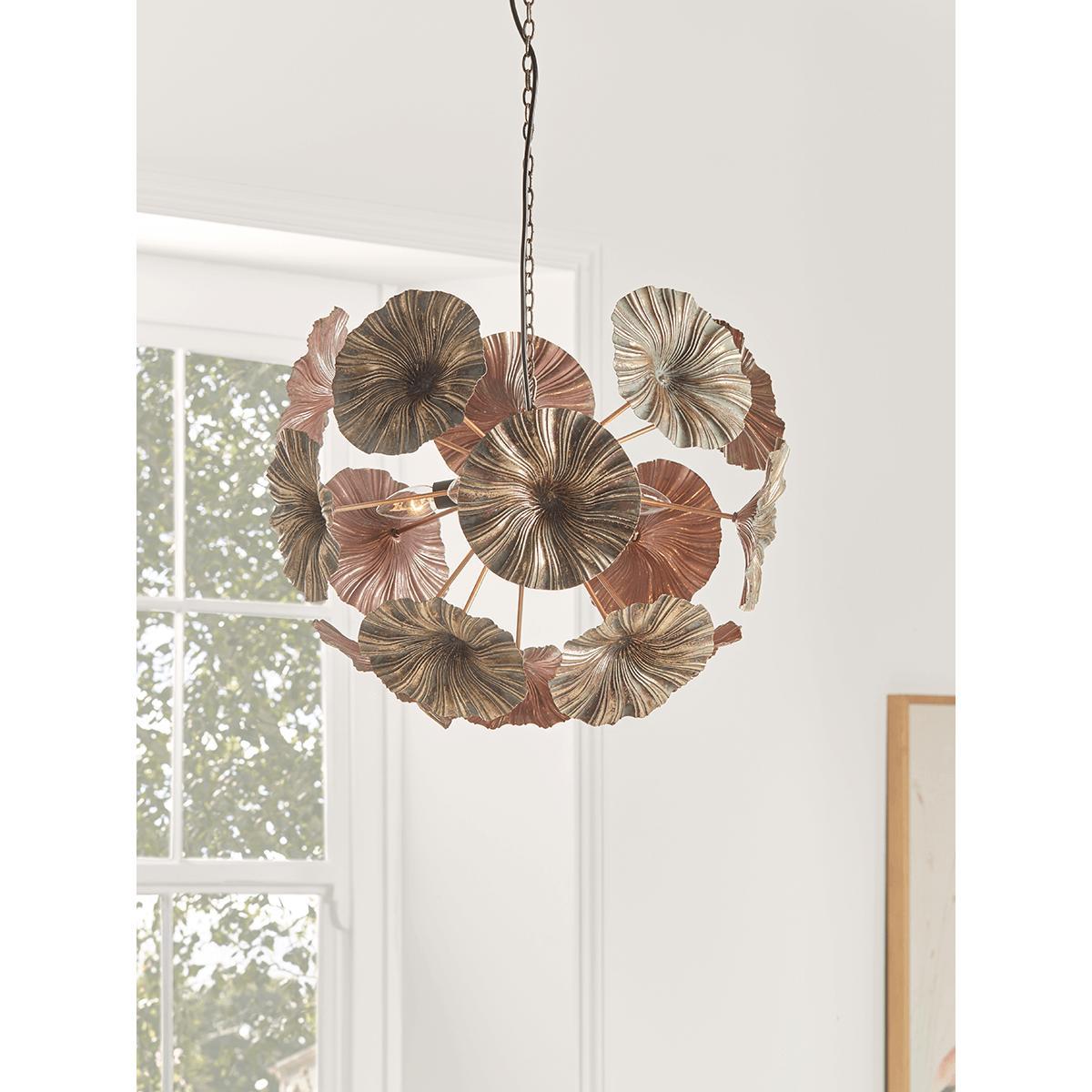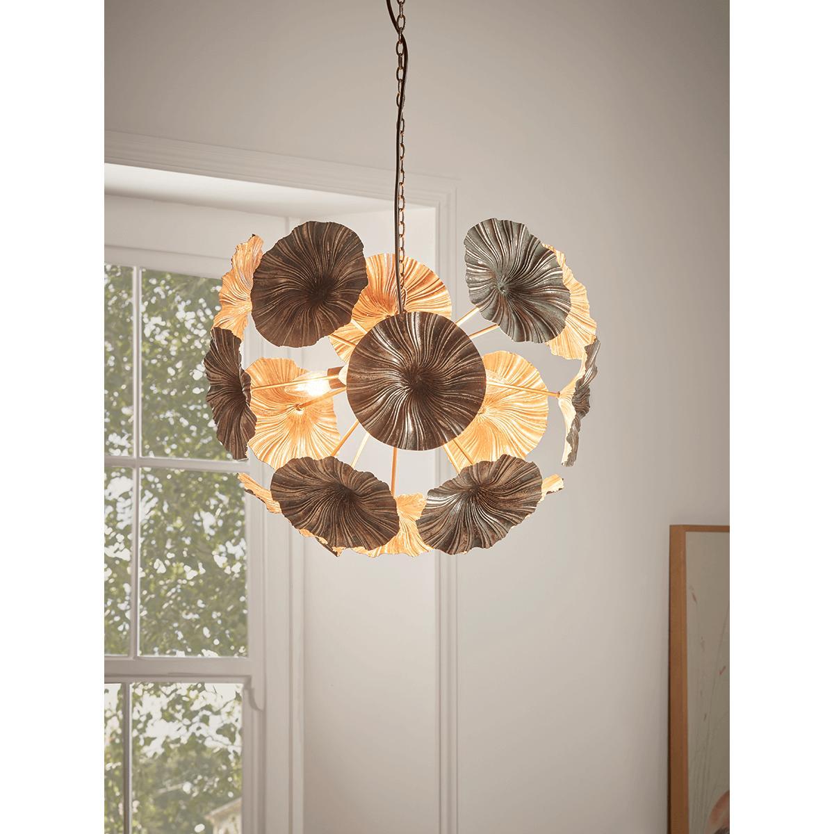 Please accept our apologies, this was a much loved item, and is sold out until next Spring!. Use lighting to create a focal point in your living space that will draw the eye whether the bulbs are lit or not with our Gilded Leaves Chandelier. Each fanned-out leaf has a beautiful antique finish that gives the whole piece a distinguished look, while the five bulbs within cast interesting shadows and warm light over the room. Discover how to create the perfect lighting scheme for your home using our. Lighting Buying Guide.
