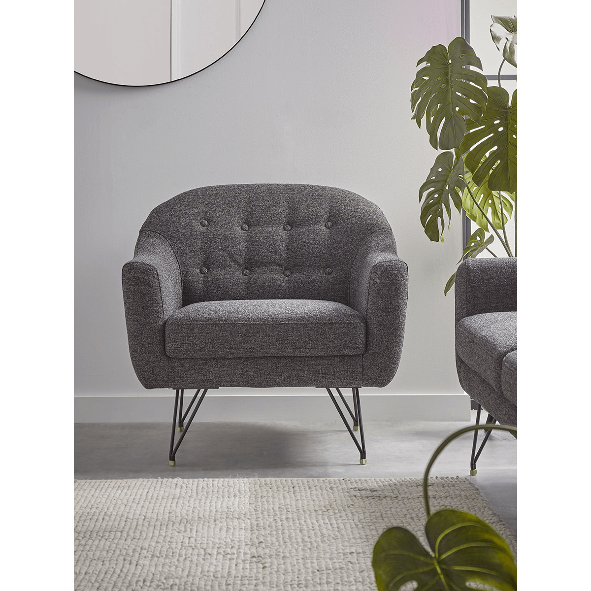 An inviting armchair that is full of modern style by a grey-toned upholstered finish, contrast hairpin frame and feature curved buttoned backrest. Wrapped in quality upholstery fabric in a timeless grey shade, our chair will sit comfortably in any contemporary interior - either as a much-loved armchair or a statement occasional chair to complete the look of a room.