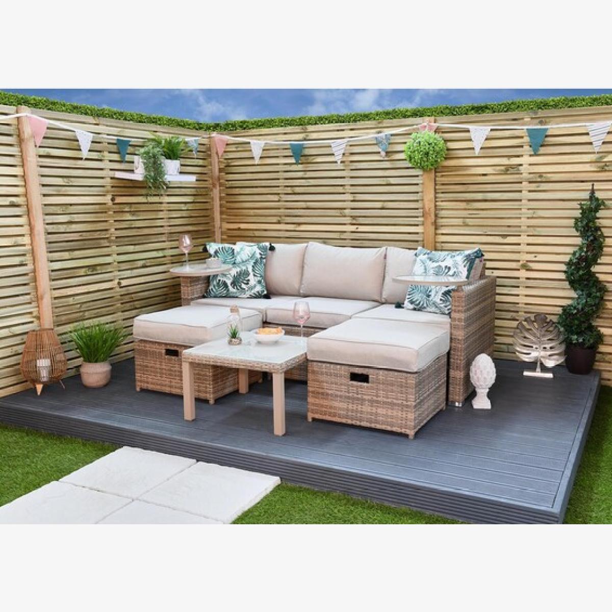 A space-saving and stylish patio furniture set, the New Hampshire Transformer Set can be pulled out to create a luxurious lounging area, or pushed against a wall to bring a great place to sit while leaving the rest of your garden free. The two ottoman stools can be slid easily under the sofa to maximise space when not in use, and when you want to really fall back into the comfort and sunbathe, they can be pulled out to be the perfect footrest. The coffee table is the ideal place to rest your drinks or a plate of snacks, and when you've packed it in for the night to head inside, it fits easily on top of the sofa in the centre. Two side tables at the arms of the sofa offer additional places to hold drinks, food, or books and magazines to entertain yourself as your lounge in the sun. The plush cushions offer not only comfort as you sit, but an elegant and luxurious appearance that will invite you into the sofa. The entirety of the New Hampshire is made from weather-resistant materials. The rattan is UV resistant, so the design won't fade over time, while the aluminium inner frame will resist rust. The cushions will repel a light rainfall so they won't end up soaked during unexpected wet days in summer, although they should be stored away when not in use.