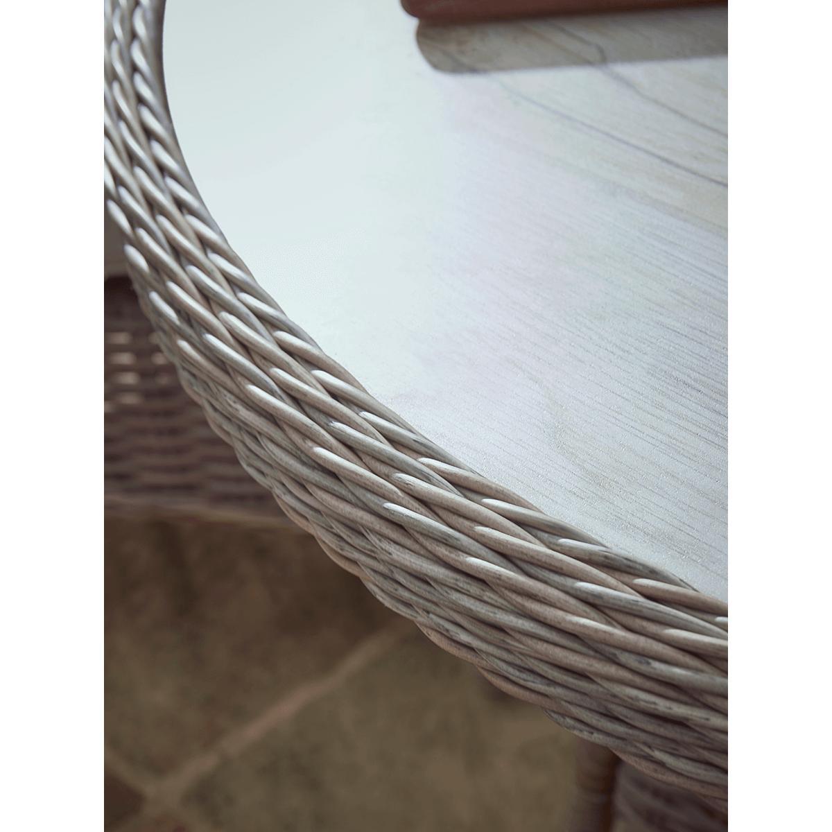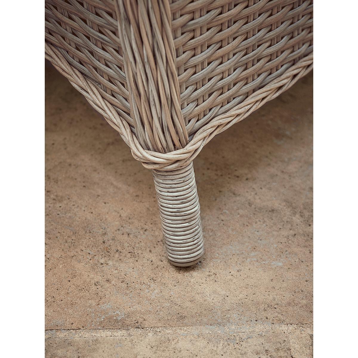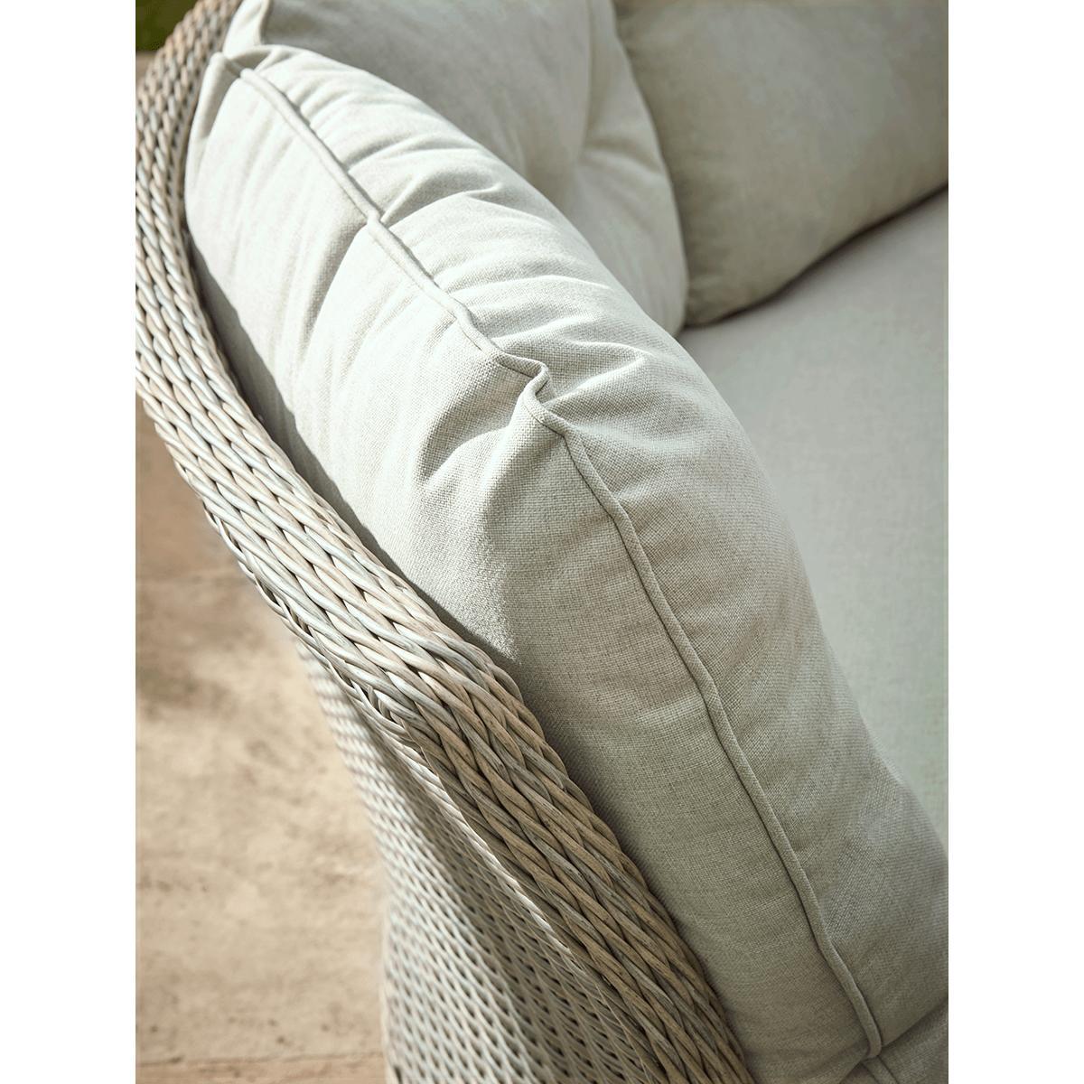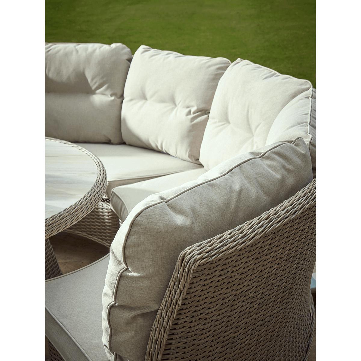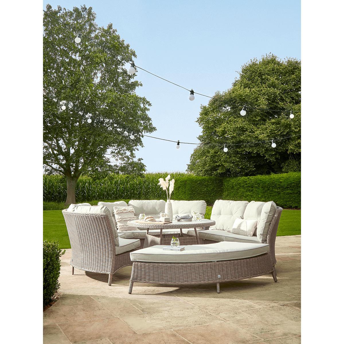 Our Hatfield range has all the charm and warmth of traditional wicker garden furniture reimagined for contemporary living. The curved modular dining set will make a grand sculptural statement in any outdoor space. The curved wicker sofa comes in three pieces with high backs and plump cushions for a nest-like seclusion. The fourth quarter of the circle is made up of a backless curved bench seat to allow a glimpse of the surrounding vista from the seating area. The set is completed with a round table at the perfect height for comfortable dining. The tabletop gives the appearance of real wood, but is actually made from glass, printed with a silvered-oak pattern - making it incredibly easy to maintain. The cushions, in a soft oatmeal shade are season proof and have eco-friendly filling made from recycled plastic bottles. View our useful. Outdoor Furniture Buying Guide.