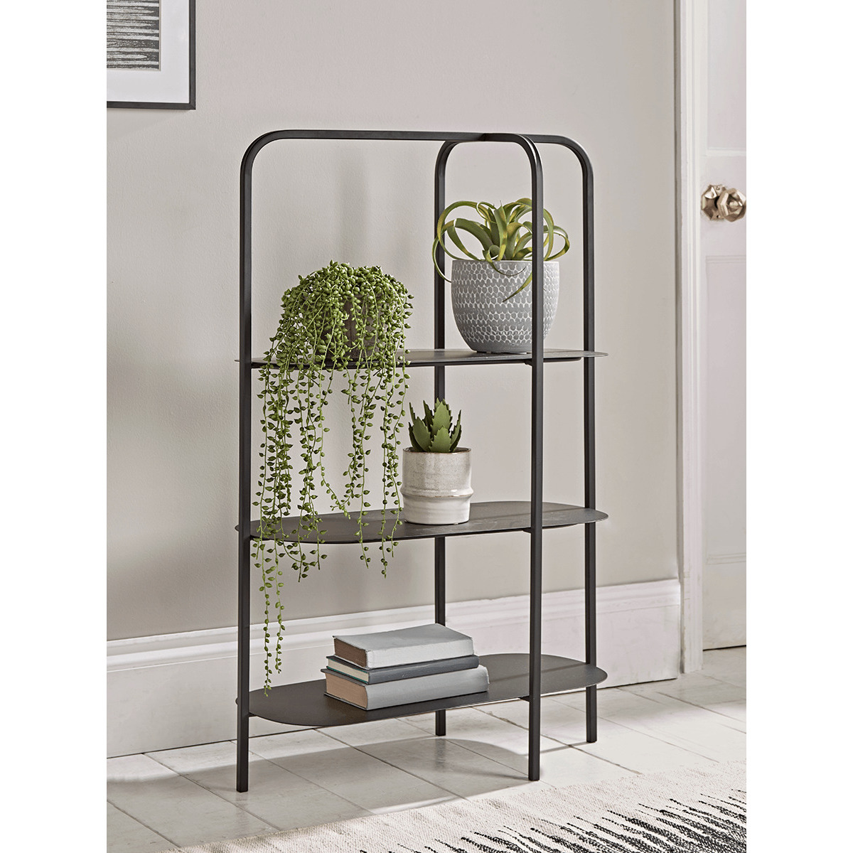 Combining the industrial tone of the dark finished metal with the sleek framework characteristic of Nordic design, our Industrial Standing Shelf is versatile enough to make a style statement in any modern living space. A well proportioned unit with a wonderful arched metal frame feature to each side, front and back features three generous shelves and ample surface for storage and display.