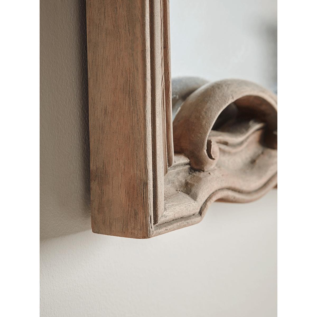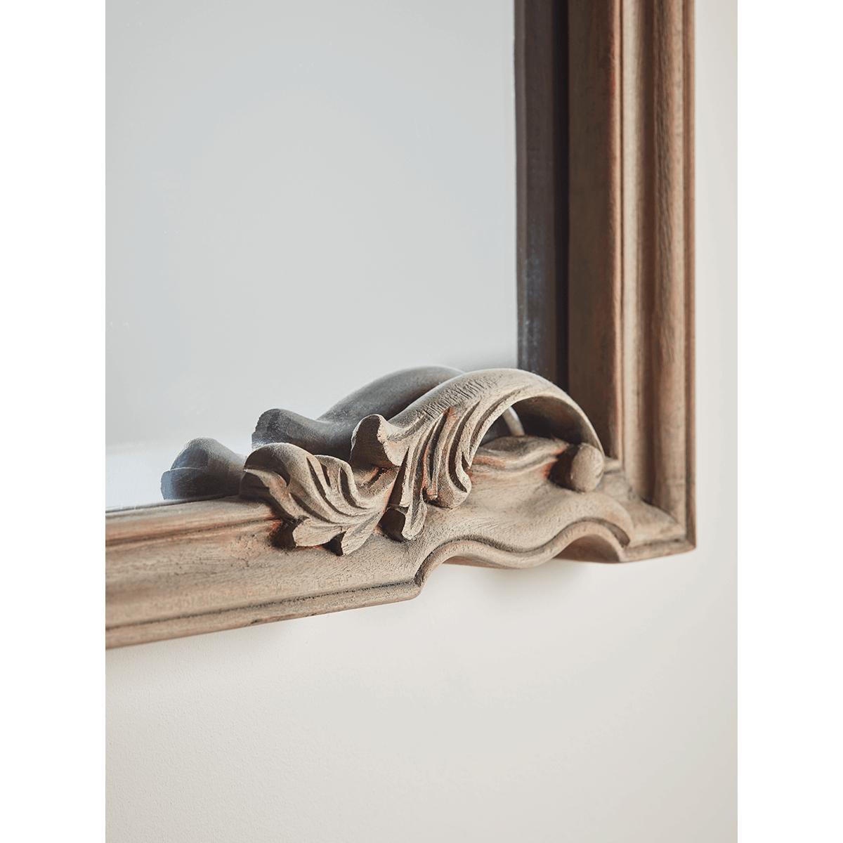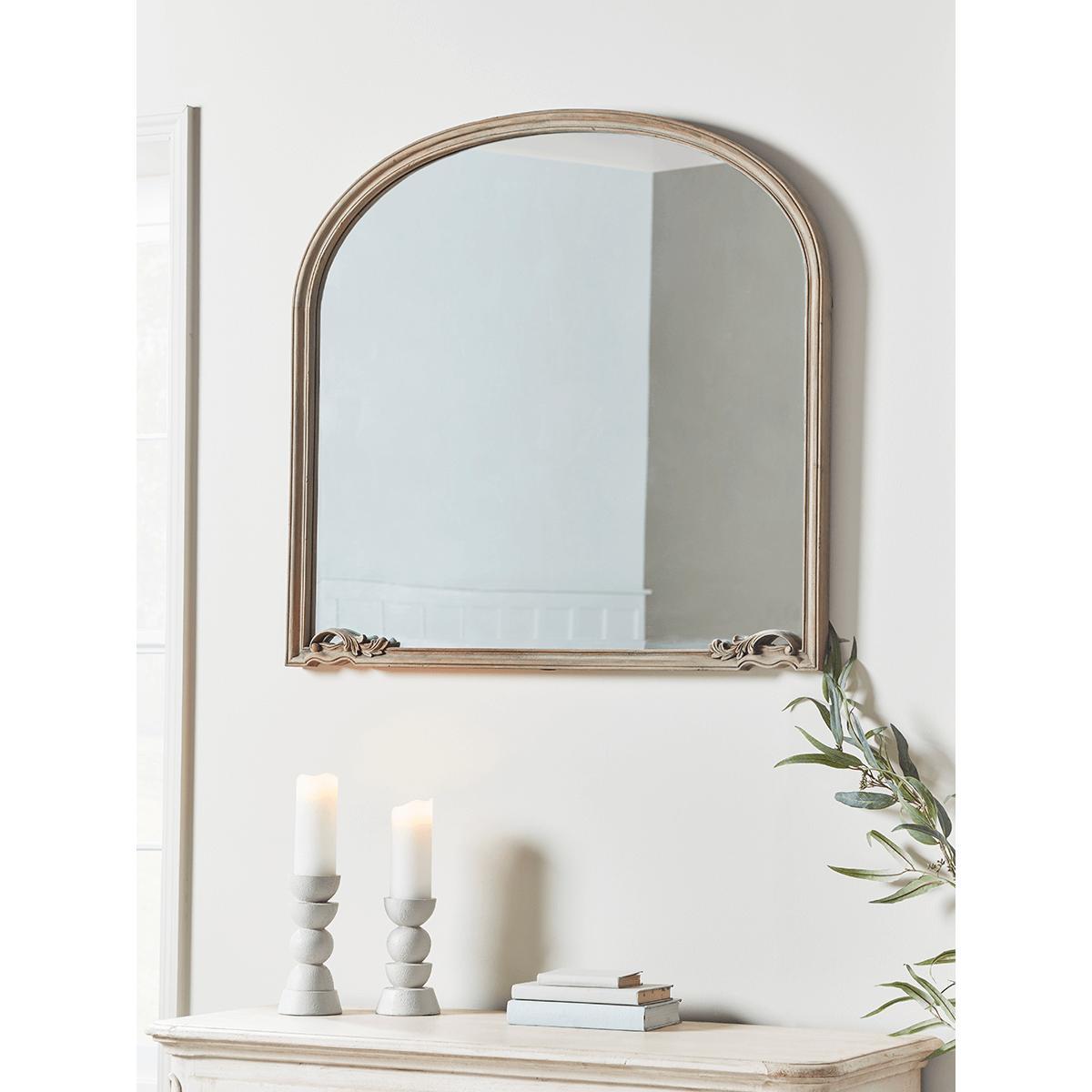 Ideally shaped for placement above a mantelpiece or one of our fabulous. Sideboards. , our Ismena Mirror, with a beautiful pine frame finished at the bottom with classical carved detailing, will elevate and brighten your space for a homely, yet sophisticated look.