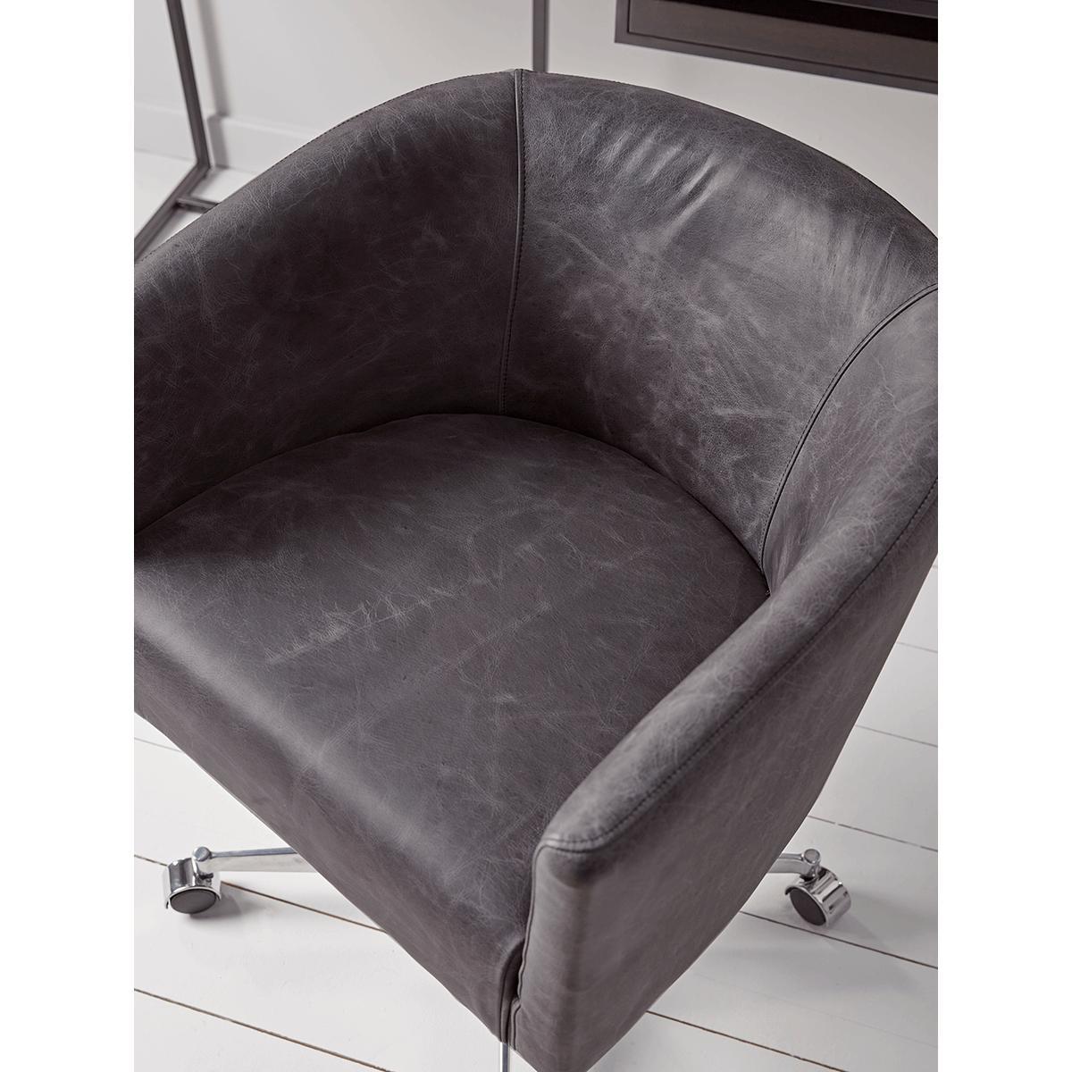 Our Leather Wheeled Tub Chair is all about comfort and home-style with all the characteristics of a work chair. The cushioned seat and tub silhouette sit above a sturdy mobile frame to make those working hours as easy as possible, whilst the luxe combination of the rich-toned leather and polished steel brings a timeless, industrial style.