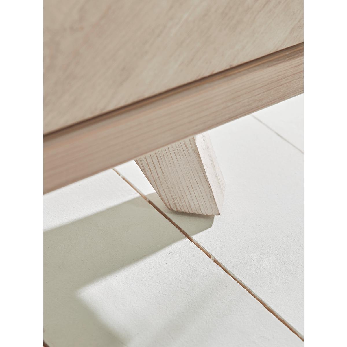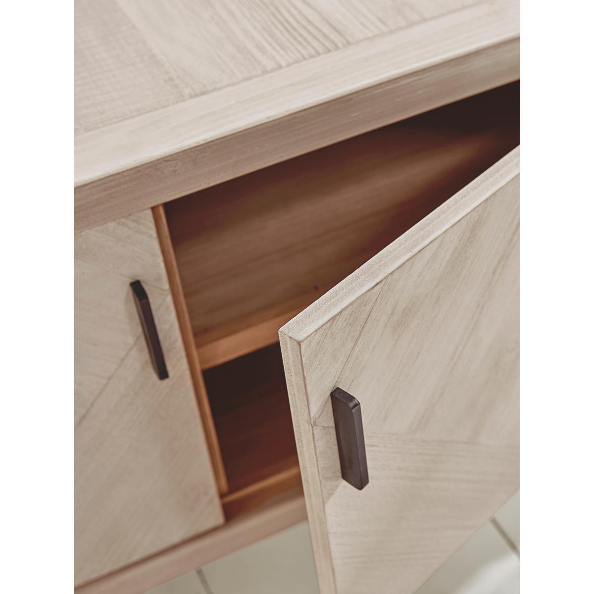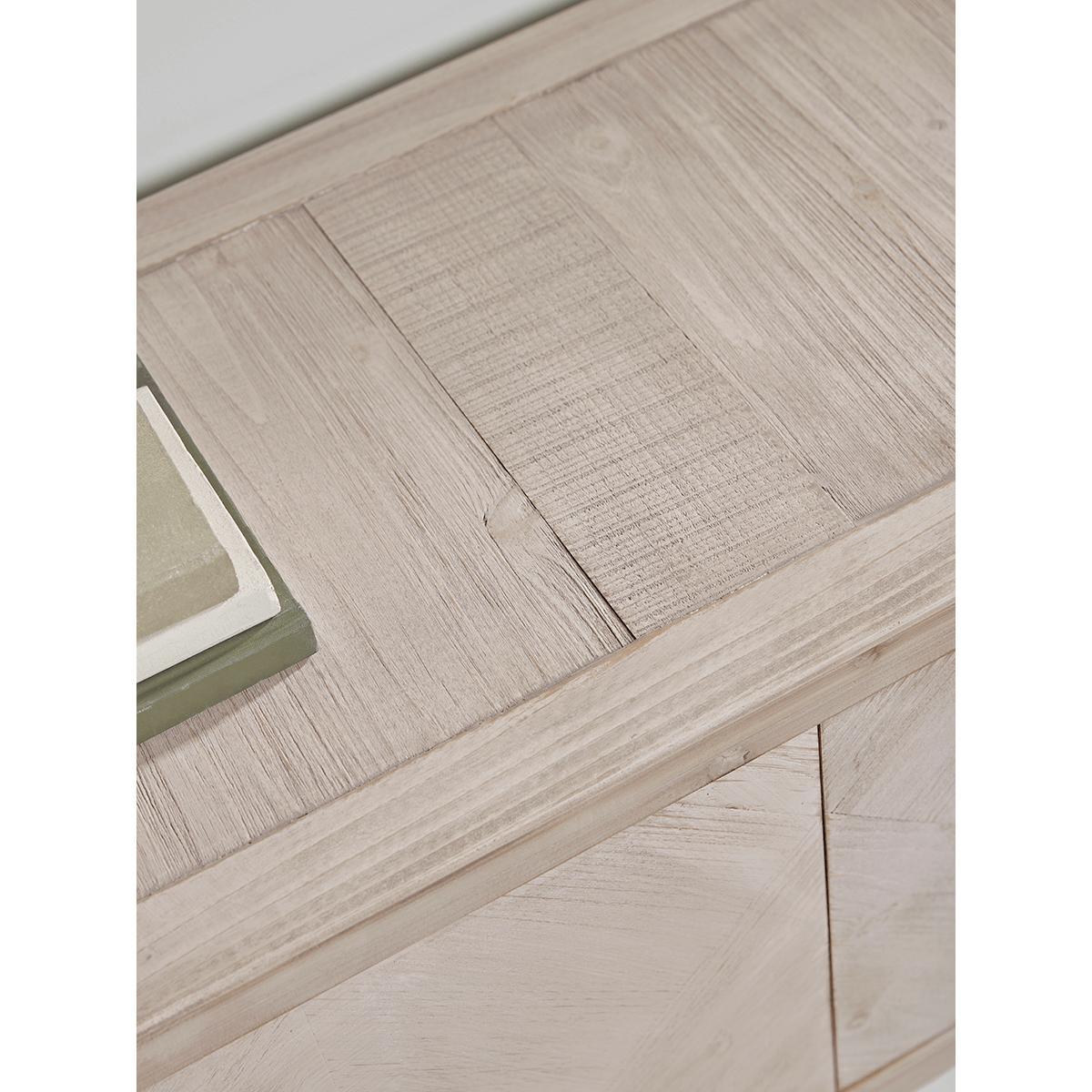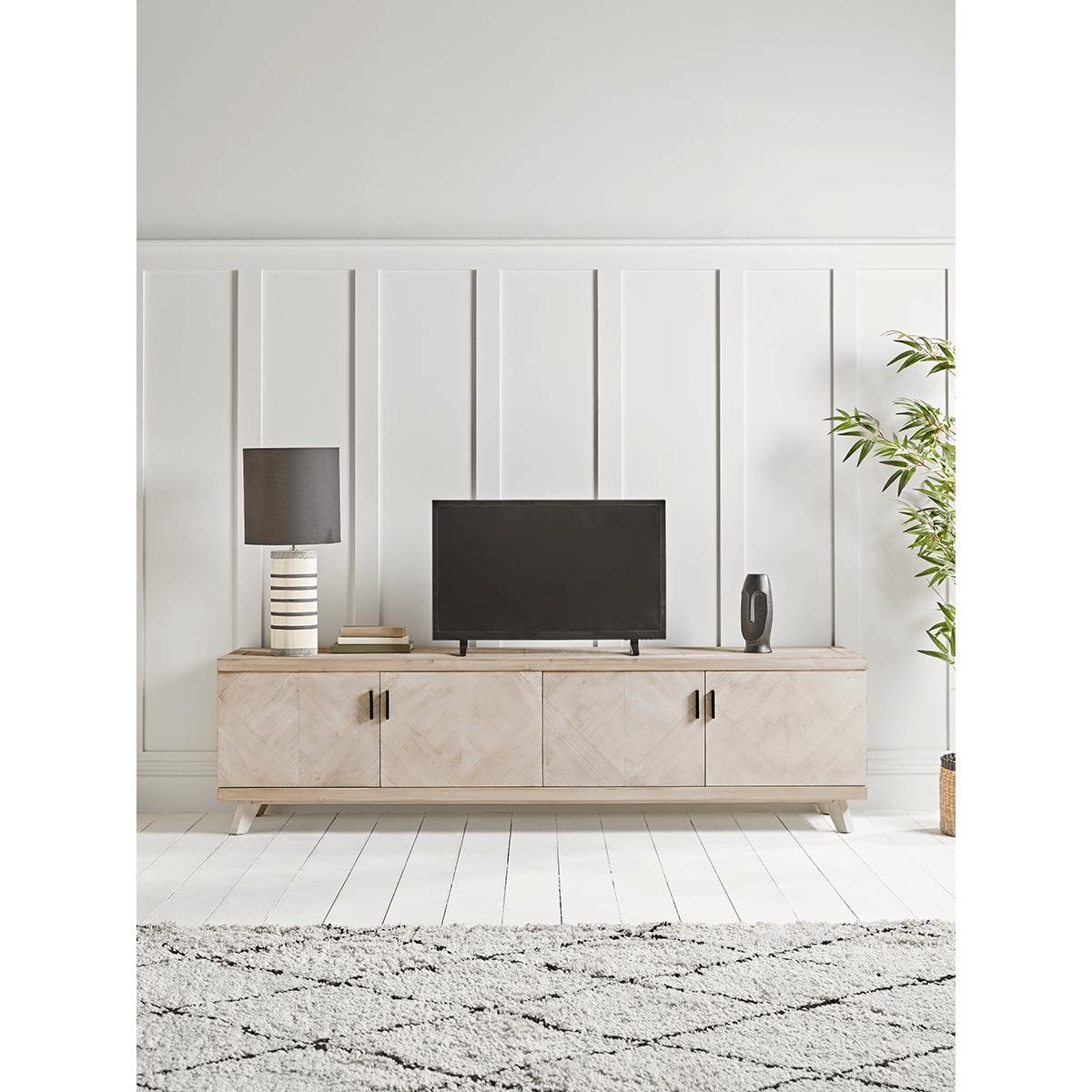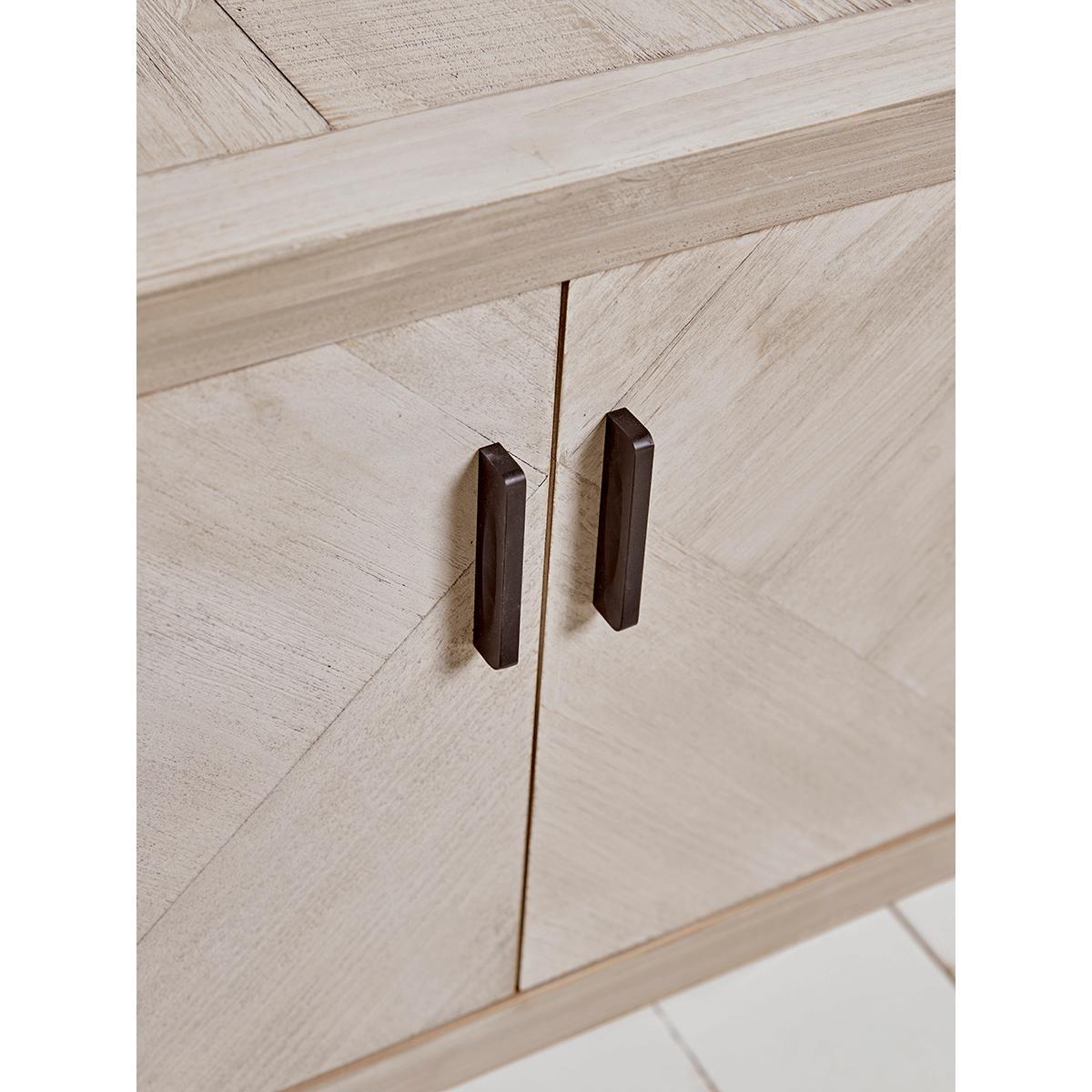 The perfect television cabinet for a neutral toned or Scandi inspired interior, our stylish Limewashed Parquet Media Unit has contemporary details to suit the modern home. A pale finished fir wood with subtle geometric detailing makes a material statement and the non-traditional cabinet handles contrast beautifully. Each piece has four feature legs and generous storage within four cupboards, whilst the top surface will fit the widest of widescreen televisions with ease.