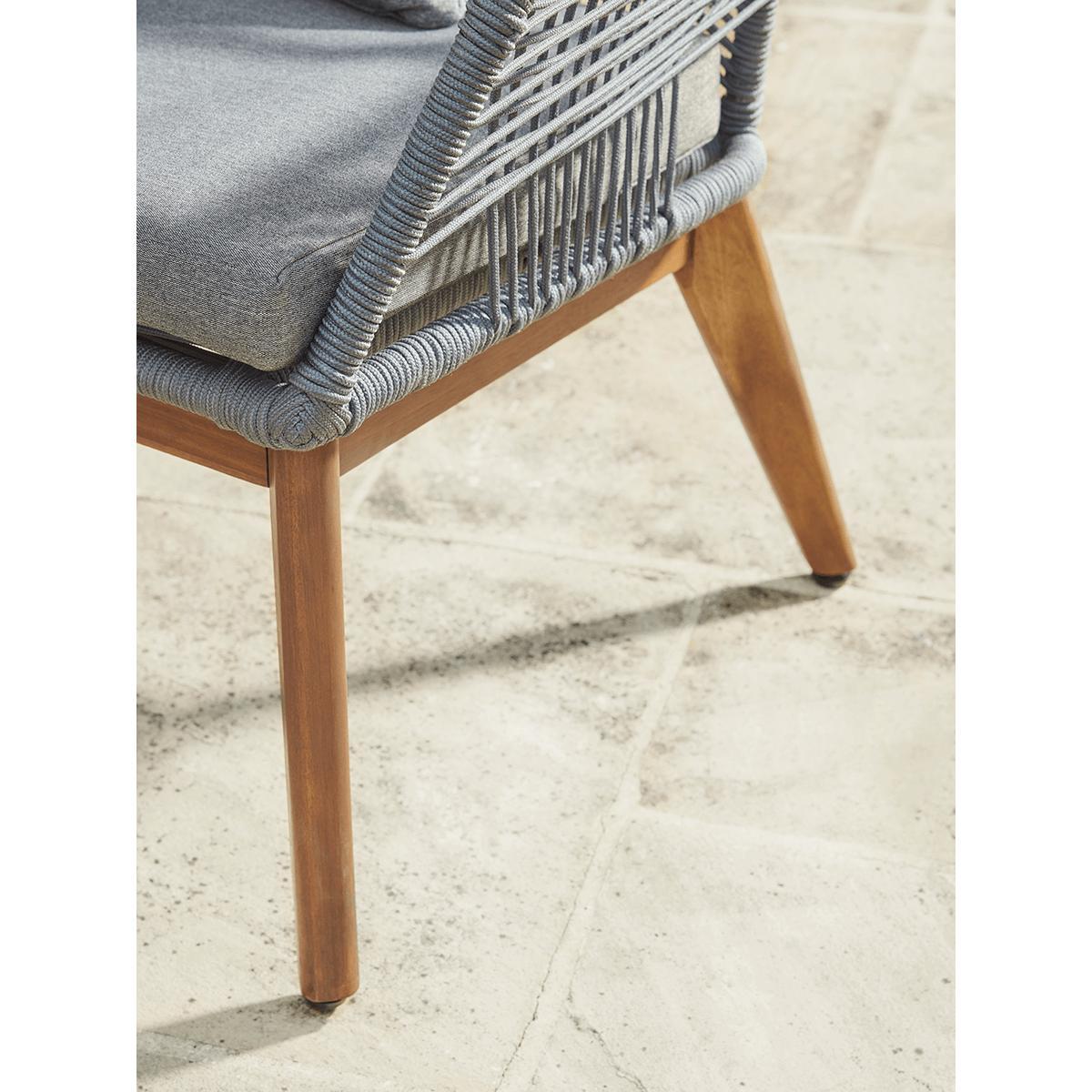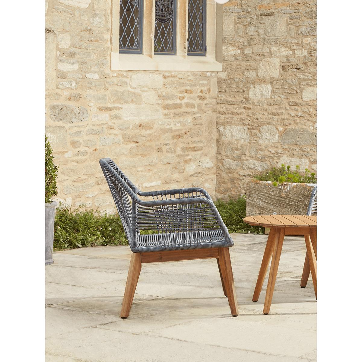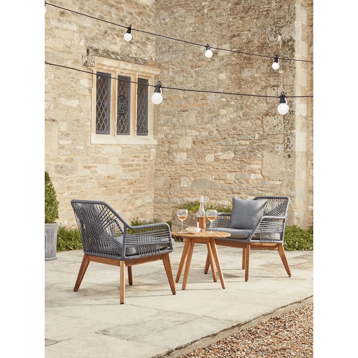 Perfect for sundowners in any setting, this is a slightly more robust take on your average bistro set, featuring strong square lines and generous comfortable armchairs. With a loosely woven faux rope composition to the seats, the chairs have acacia wood legs which have been given a lovely rich teak coloured finish which contrasts beautifully with the grey. The accompanying low round slatted table is in the same wood. This set includes two chairs and a table. View our useful. Outdoor Furniture Buying Guide.