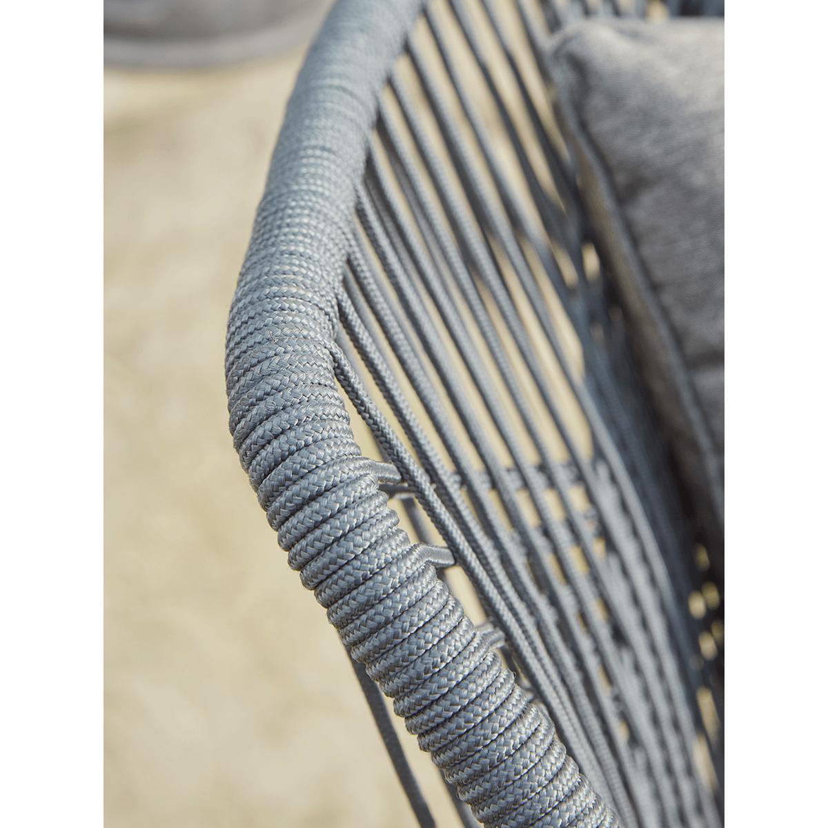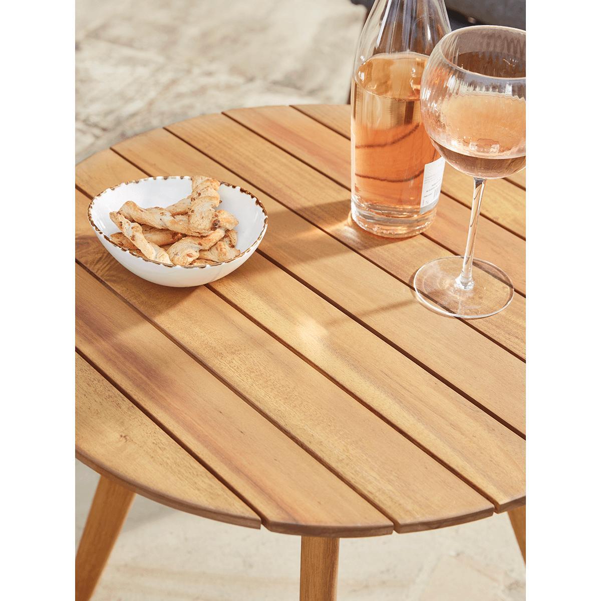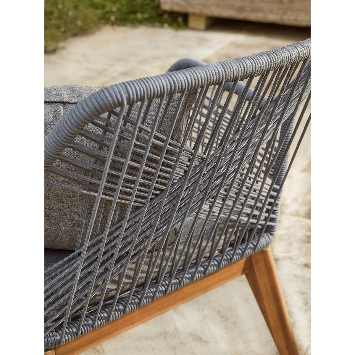 Perfect for sundowners in any setting, this is a slightly more robust take on your average bistro set, featuring strong square lines and generous comfortable armchairs. With a loosely woven faux rope composition to the seats, the chairs have acacia wood legs which have been given a lovely rich teak coloured finish which contrasts beautifully with the grey. The accompanying low round slatted table is in the same wood. This set includes two chairs and a table. View our useful. Outdoor Furniture Buying Guide.