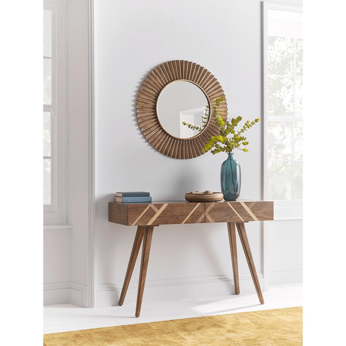 Crafted using smooth, polished mango wood and beautifully enhanced by linear brass detailing, our Linea Console Table has a luxurious tone that makes a statement. Simple yet commanding in shape the Linea range will uplift your contemporary or mid-century style. With two wide drawers, store everything you need at hand in the hallway. The splayed, tapered legs will keep the space feeling light and uncluttered, whilst the smooth, generous surface will offer up plenty of inviting styling opportunities, perhaps with a. Lamp. And. Decorative accessories. A. Linea Display Shelf. Is also available.