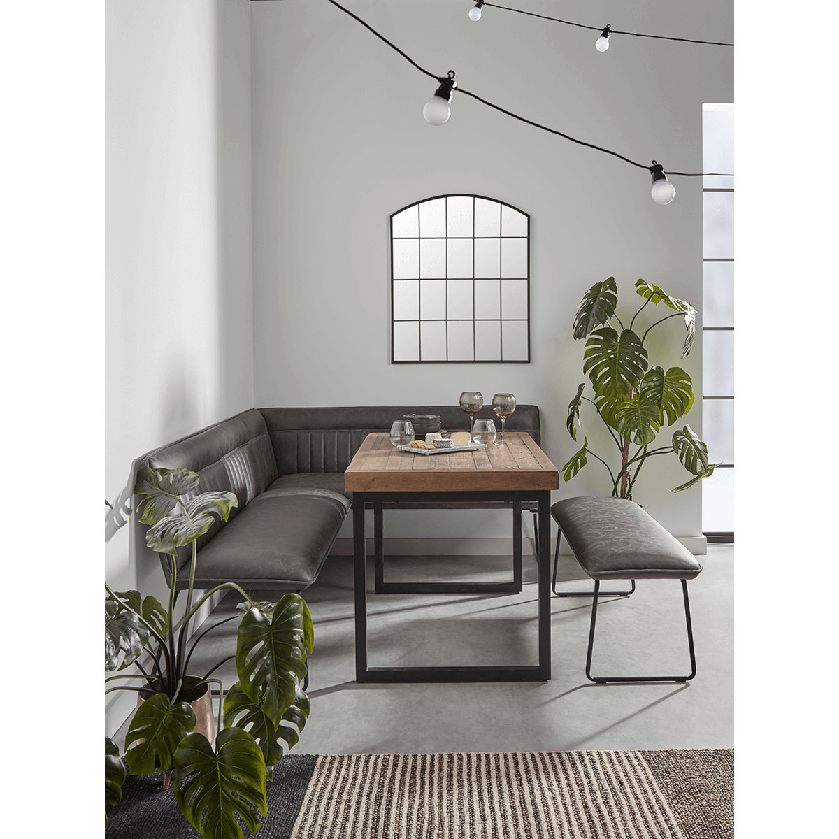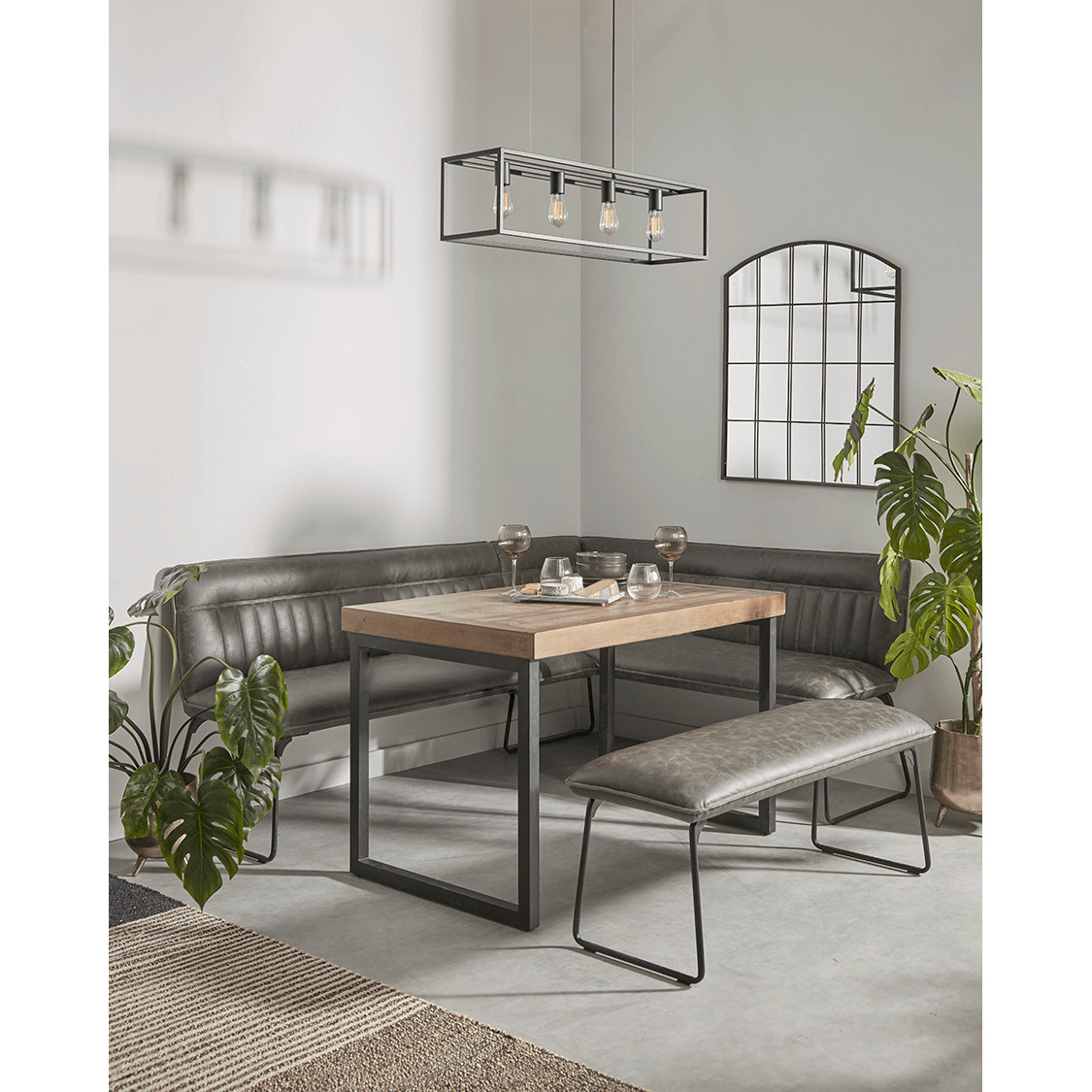 Our Alden Loft Corner Dining Set of a bench, corner bench and table, comes with plenty of New York loft-inspired style. The top of our industrial look table is crafted from solid wood with an aged character, encased in a smooth edge above a dark bracket frame. The accompanying bench and corner bench provide comfortable yet compact seating and both are upholstered in a rich-toned faux leather with cushioning stitch detailing. The versatile nature of a bench seat and compact table serves limited dining spaces and open plan spaces really well. Bench seats do not limit numbers in the same way a standard dining chair might, and their placement can put a focus on a dining table, which defines the space effectively. As kitchen and dining rooms continue to be the most social rooms of the house, we’re making your dining-living easy with our Alden Loft Corner Dining Set.