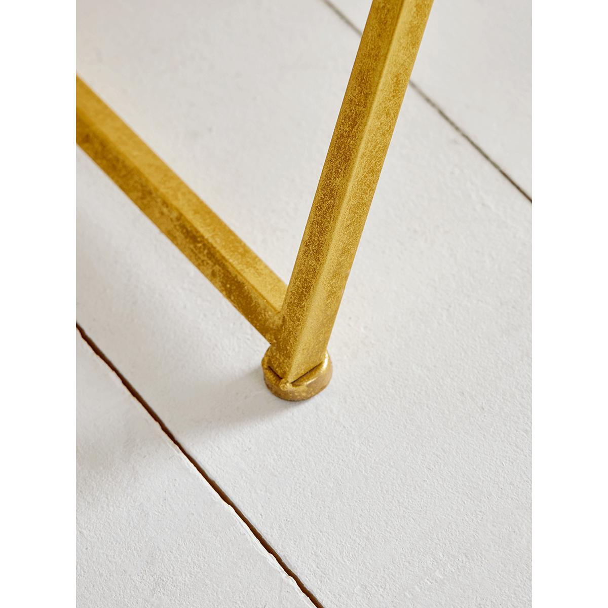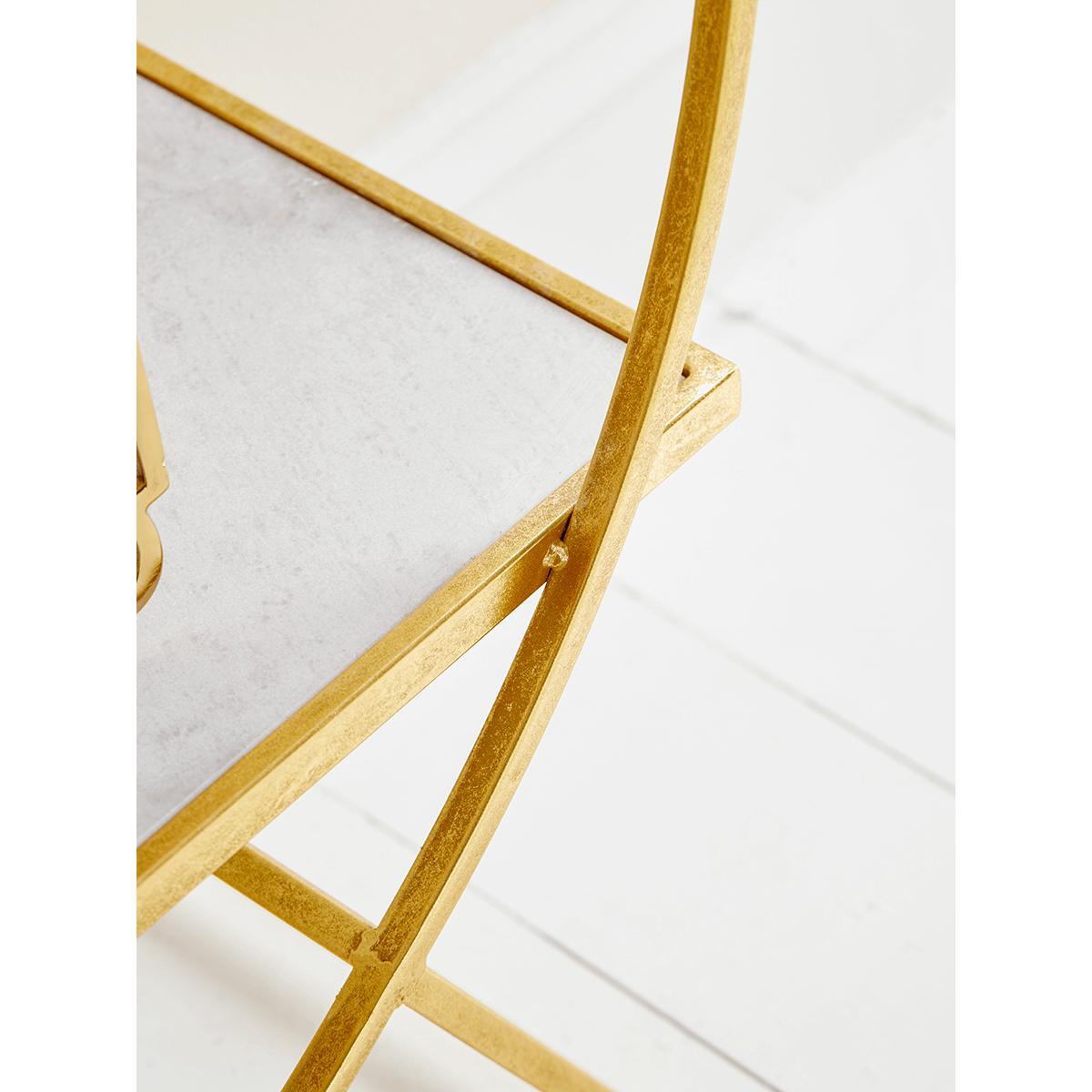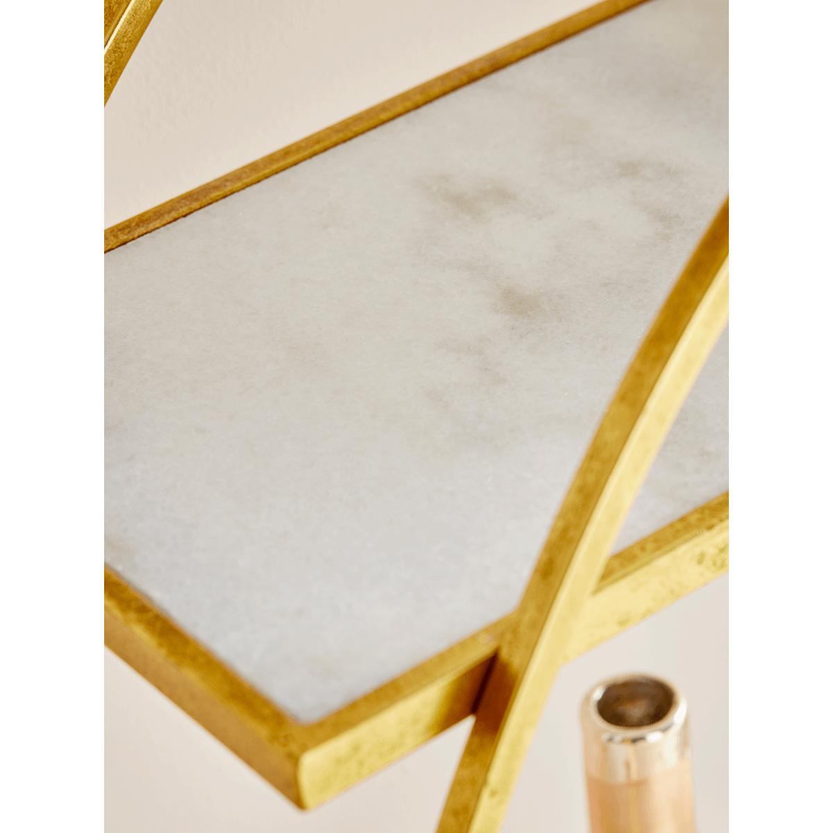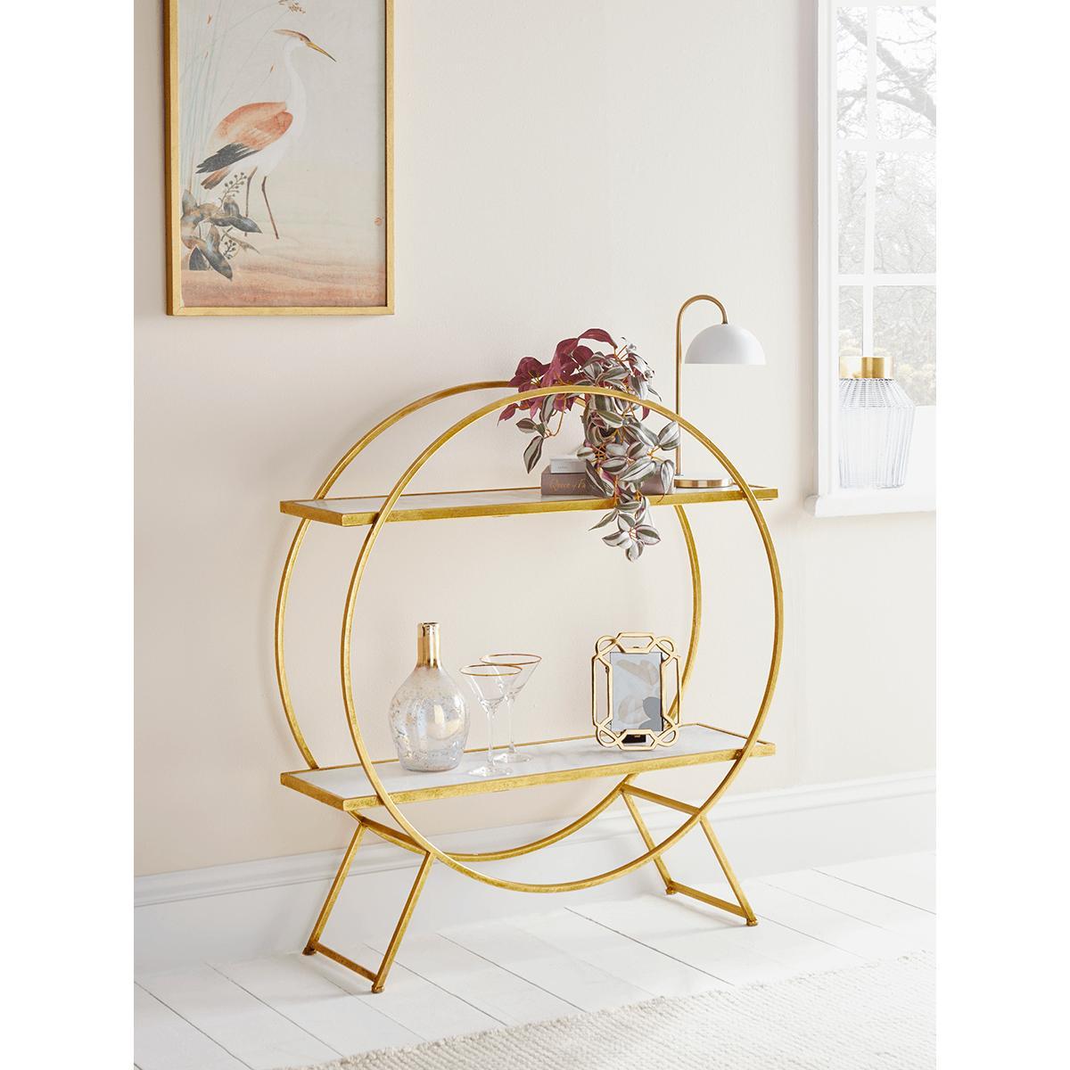 Epitomising the glamour of the Art Deco period, this circular shelf unit will elevate your living space, hallway or bedroom to the next level of elegance. The rich golden colour of the iron frame contrasts with the coolness of the white marble shelves and will look fantastic against both a pastel or bold palette. It will look superb with a simple display of books and a few choice ornaments.
