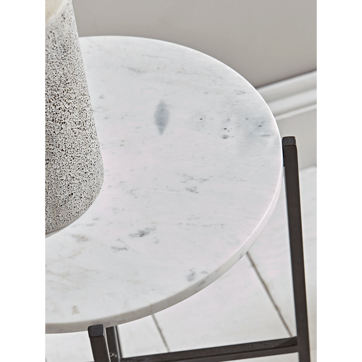 With a foldable metal frame and stunning white marble top, our elegant side table is both useful and decorative. Position by your bed or sofa, or throughout your home as an occasional table on which to place a lamp, or on which to display faux planting.