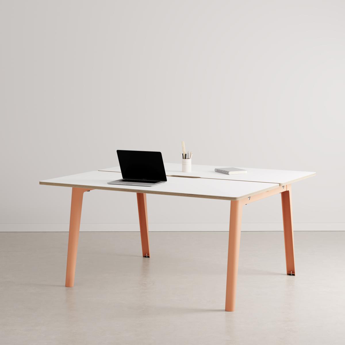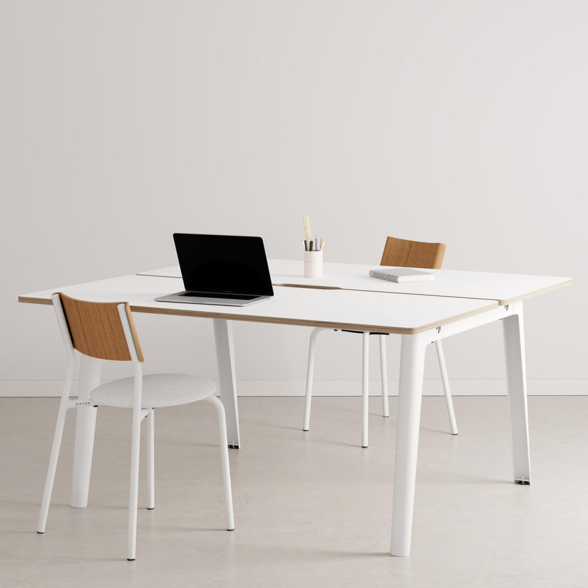 New Modern is a collection of tables and desks that’s 100% made in Europe, well thought out and produced to last. Like every project from the French item brand TIPTOE, New Modern is part of a sustainable, eco-design approach, taking care to control its impact throughout the product's life cycle. New Modern open space desks have been specially designed for coworking spaces. They are equipped with openings on the top for the cables and steel troughs to pass through, which attach under the top to put a power strip in and have connections to hand. You have the option of adding troughs according to your needs (additional trough sold on our website). This co-working desk makes it easy to set up a connected space in an open area, meeting room or break room. The generous dimensions allow several people to sit down while maintaining a large workspace. New Modern tables consist of just a few elements, all of them useful, very robust, easily separable and repairable if necessary. These tables consist of two powder-coated steel trestle legs into which are inserted two cylindrical stainless steel support beams. The top is simply screwed onto the legs. The tables are delivered flat to limit the environmental impact during storage and shipping (assembly is super-easy). The packaging is made of a minimum 80% recycled paper. The legs are made of steel, a material that’s both very strong and infinitely recyclable (it’s the most recycled material in the world). The top is available in different materials: recycled or laminated plastic. The recycled plastic tops are made from waste: hundreds of yoghurt pots are needed to make a top. The plastic waste collected is reduced to chips and then pressed (without adding binder) to form the top. The white top is dotted with bursts of colour, echoing fragile ocean coral. The speckled pattern also evokes terrazzo, the star material of decoration. Each recycled plastic top is unique, the colour and patterns may vary, which is what makes it so charming. TIPTOE has chosen 100% European production alongside partners with excellent know-how. NEW MODERN wooden tops are made in Poland, the steel legs in Bulgaria while all the precision mechanical parts and assembly items come from family workshops in France near Chamonix. The final assembly is carried out in France in an ESAT, a medico-social establishment that works for the social and professional integration of people with disabilities.