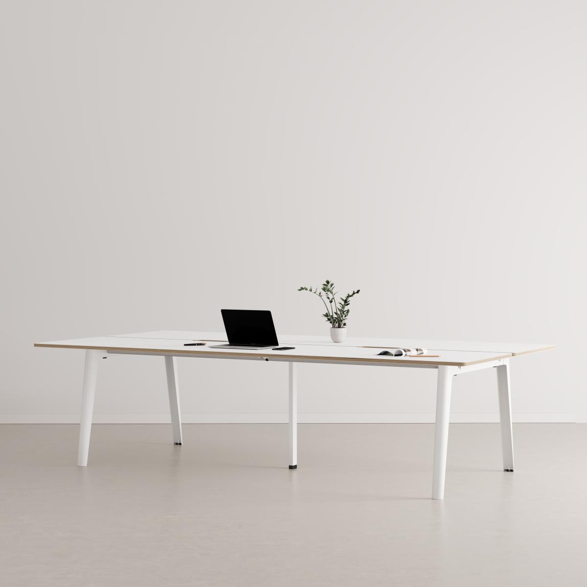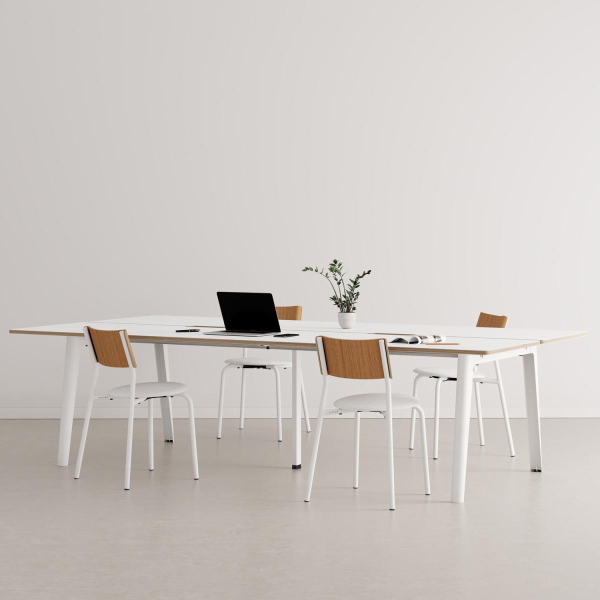 New Modern is a collection of tables and desks that’s 100% made in Europe, well thought out and produced to last. Like every project from the French item brand TIPTOE, New Modern is part of a sustainable, eco-design approach, taking care to control its impact throughout the product's life cycle. New Modern open space desks have been specially designed for coworking spaces. They are equipped with openings on the top for the cables and steel troughs to pass through, which attach under the top to put a power strip in and have connections to hand. You have the option of adding troughs according to your needs (additional trough sold on our website). This co-working desk makes it easy to set up a connected space in an open area, meeting room or break room. The generous dimensions allow several people to sit down while maintaining a large workspace. New Modern tables consist of just a few elements, all of them useful, very robust, easily separable and repairable if necessary. These tables consist of two powder-coated steel trestle legs into which are inserted two cylindrical stainless steel support beams. The top is simply screwed onto the legs. The tables are delivered flat to limit the environmental impact during storage and shipping (assembly is super-easy). The packaging is made of a minimum 80% recycled paper. The legs are made of steel, a material that’s both very strong and infinitely recyclable (it’s the most recycled material in the world). The top is available in different materials: recycled or laminated plastic. The recycled plastic tops are made from waste: hundreds of yoghurt pots are needed to make a top. The plastic waste collected is reduced to chips and then pressed (without adding binder) to form the top. The white top is dotted with bursts of colour, echoing fragile ocean coral. The speckled pattern also evokes terrazzo, the star material of decoration. Each recycled plastic top is unique, the colour and patterns may vary, which is what makes it so charming. TIPTOE has chosen 100% European production alongside partners with excellent know-how. NEW MODERN wooden tops are made in Poland, the steel legs in Bulgaria while all the precision mechanical parts and assembly items come from family workshops in France near Chamonix. The final assembly is carried out in France in an ESAT, a medico-social establishment that works for the social and professional integration of people with disabilities.
