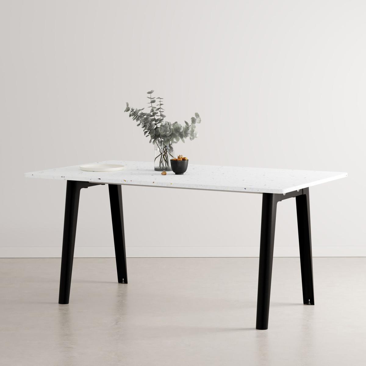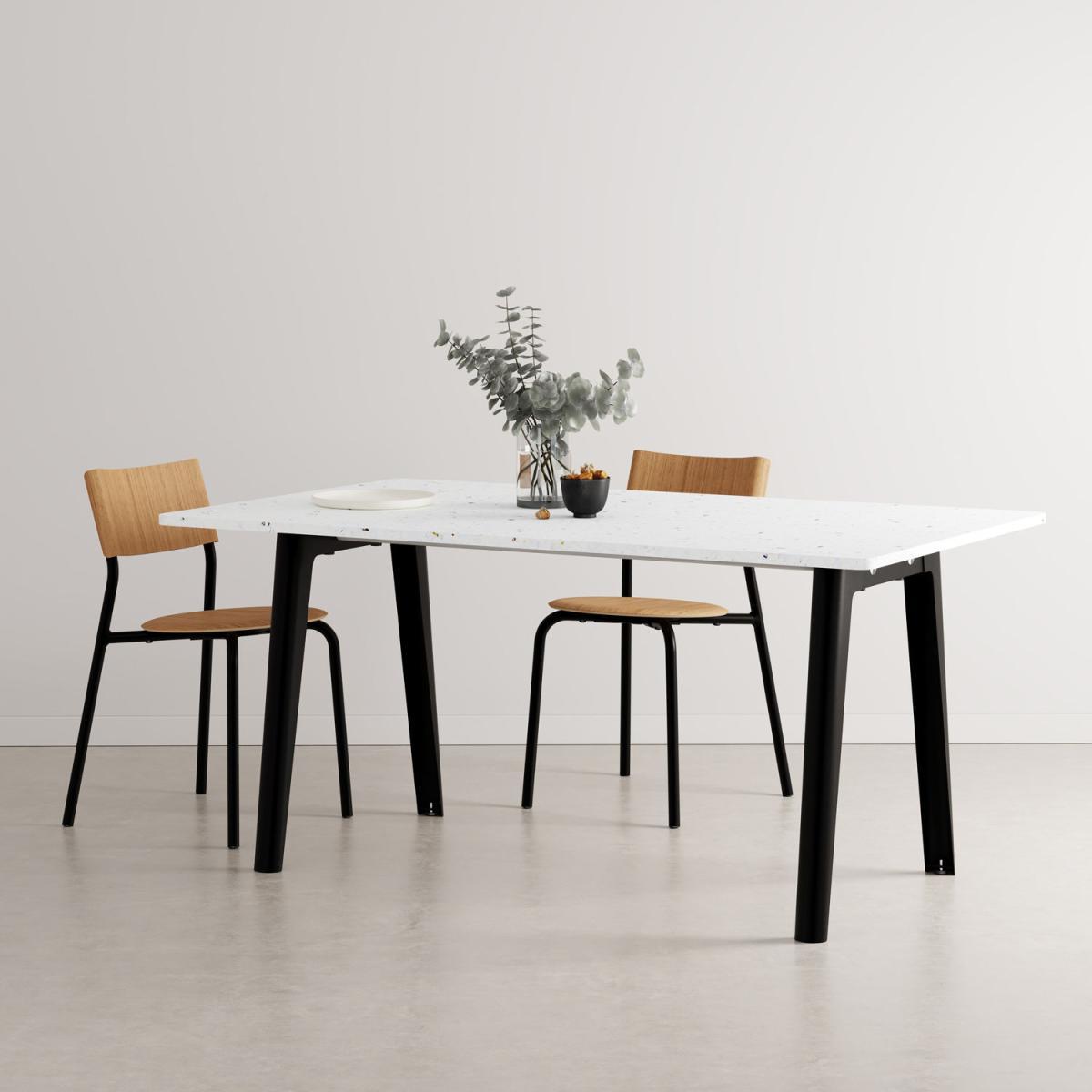 New Modern is a collection of tables and desks that’s 100% made in Europe, well thought out and produced to last. Like every project from the French item brand TIPTOE, New Modern is part of a sustainable, eco-design approach, taking care to control its impact throughout the product's life cycle. New Modern tables consist of just a few elements, all of them useful, very robust, easily separable and repairable if necessary. These tables consist of two powder-coated steel trestle legs into which are inserted two cylindrical stainless steel support beams. The top is simply screwed onto the legs. The tables are delivered flat to limit the environmental impact during storage and shipping (assembly is super-easy). The packaging is made of a minimum 80% recycled paper. The legs are made of steel, a material that’s both very strong and infinitely recyclable (it’s the most recycled material in the world). The top is available in different materials: eco-certified wood, recycled or laminate plastic. The oak plywood tops are made from wood from sustainably managed European forests (PEFC or FSC label). The top has a core made of solid, slatted fir veneered with natural oak and protected by a water-based varnish. The recycled plastic tops are made from waste: hundreds of yoghurt pots are needed to make a top. The plastic waste collected is reduced to chips and then pressed (without adding binder) to form the top. The white top is dotted with bursts of colour, echoing fragile ocean coral. The speckled pattern also evokes terrazzo, the star material of decoration. Each recycled plastic top is unique, the colour and patterns may vary, which is what makes it so charming. The different shapes and sizes of tops adapt to a wide range of contexts: dining table in a living room or kitchen, XXL table that can accommodate up to 12 people, individual desk in a private environment or even a large open space desk for several people. TIPTOE has chosen 100% European production alongside partners with excellent know-how. NEW MODERN wooden tops are made in Poland, the steel legs in Bulgaria while all the precision mechanical parts and assembly items come from family workshops in France near Chamonix. The final assembly is carried out in France in an ESAT, a medico-social establishment that works for the social and professional integration of people with disabilities.