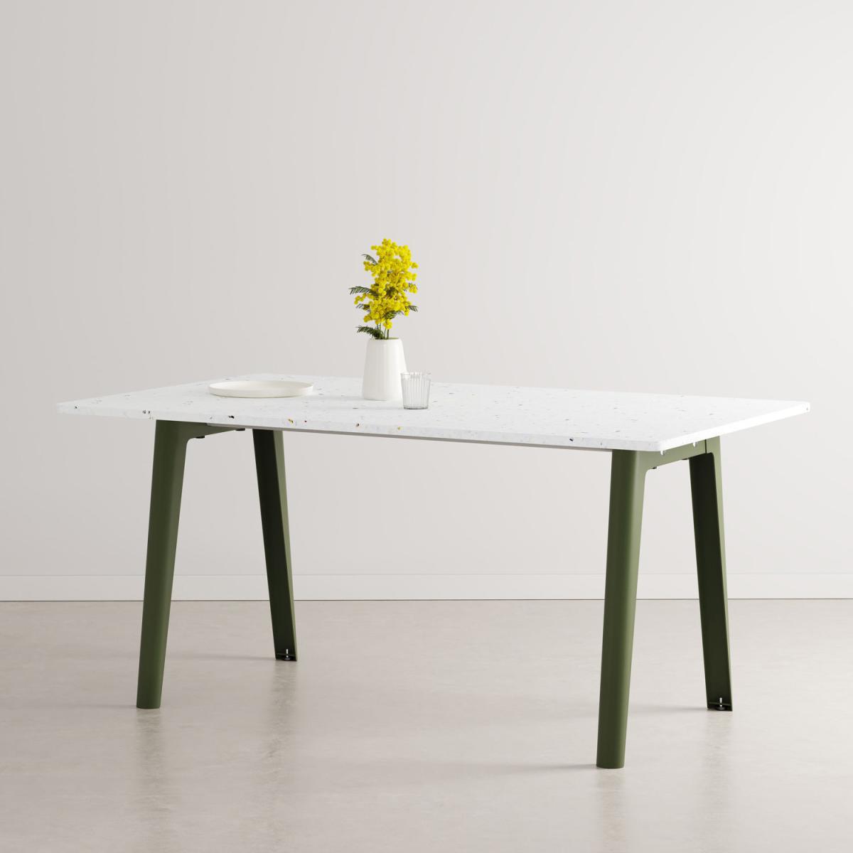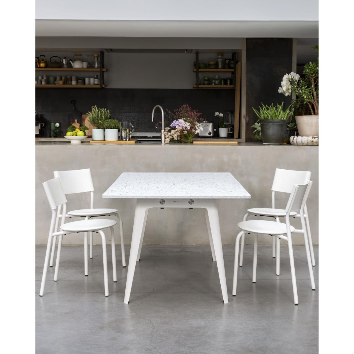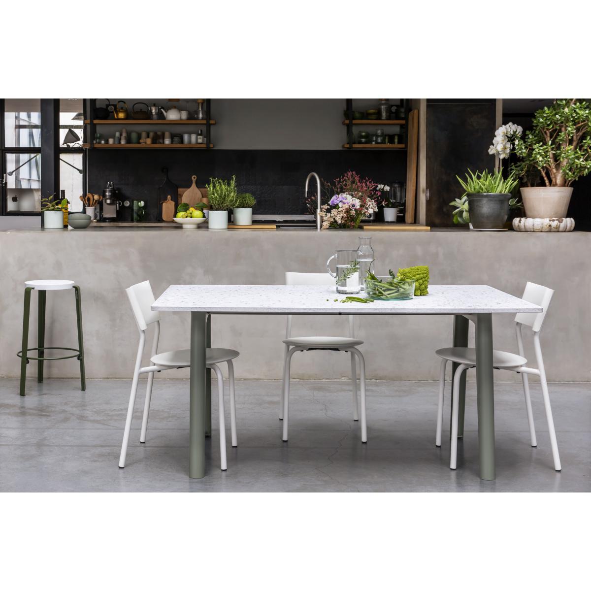 New Modern is a collection of tables and desks that’s 100% made in Europe, well thought out and produced to last. Like every project from the French item brand TIPTOE, New Modern is part of a sustainable, eco-design approach, taking care to control its impact throughout the product's life cycle. New Modern tables consist of just a few elements, all of them useful, very robust, easily separable and repairable if necessary. These tables consist of two powder-coated steel trestle legs into which are inserted two cylindrical stainless steel support beams. The top is simply screwed onto the legs. The tables are delivered flat to limit the environmental impact during storage and shipping (assembly is super-easy). The packaging is made of a minimum 80% recycled paper. The legs are made of steel, a material that’s both very strong and infinitely recyclable (it’s the most recycled material in the world). The top is available in different materials: eco-certified wood, recycled or laminate plastic. The oak plywood tops are made from wood from sustainably managed European forests (PEFC or FSC label). The top has a core made of solid, slatted fir veneered with natural oak and protected by a water-based varnish. The recycled plastic tops are made from waste: hundreds of yoghurt pots are needed to make a top. The plastic waste collected is reduced to chips and then pressed (without adding binder) to form the top. The white top is dotted with bursts of colour, echoing fragile ocean coral. The speckled pattern also evokes terrazzo, the star material of decoration. Each recycled plastic top is unique, the colour and patterns may vary, which is what makes it so charming. The different shapes and sizes of tops adapt to a wide range of contexts: dining table in a living room or kitchen, XXL table that can accommodate up to 12 people, individual desk in a private environment or even a large open space desk for several people. TIPTOE has chosen 100% European production alongside partners with excellent know-how. NEW MODERN wooden tops are made in Poland, the steel legs in Bulgaria while all the precision mechanical parts and assembly items come from family workshops in France near Chamonix. The final assembly is carried out in France in an ESAT, a medico-social establishment that works for the social and professional integration of people with disabilities.
