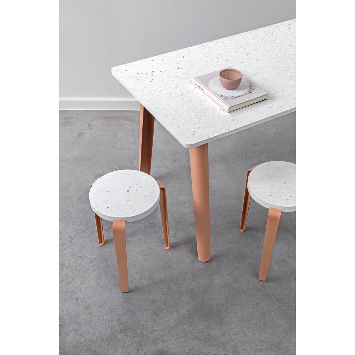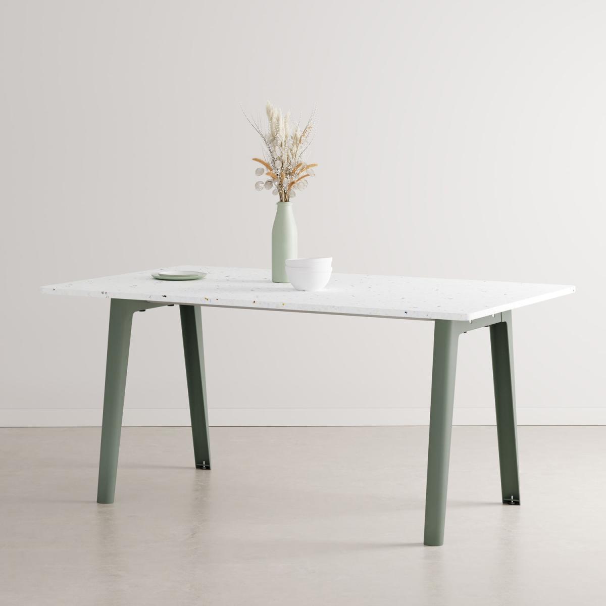 New Modern is a collection of tables and desks that’s 100% made in Europe, well thought out and produced to last. Like every project from the French item brand TIPTOE, New Modern is part of a sustainable, eco-design approach, taking care to control its impact throughout the product's life cycle. New Modern tables consist of just a few elements, all of them useful, very robust, easily separable and repairable if necessary. These tables consist of two powder-coated steel trestle legs into which are inserted two cylindrical stainless steel support beams. The top is simply screwed onto the legs. The tables are delivered flat to limit the environmental impact during storage and shipping (assembly is super-easy). The packaging is made of a minimum 80% recycled paper. The legs are made of steel, a material that’s both very strong and infinitely recyclable (it’s the most recycled material in the world). The top is available in different materials: eco-certified wood, recycled or laminate plastic. The oak plywood tops are made from wood from sustainably managed European forests (PEFC or FSC label). The top has a core made of solid, slatted fir veneered with natural oak and protected by a water-based varnish. The recycled plastic tops are made from waste: hundreds of yoghurt pots are needed to make a top. The plastic waste collected is reduced to chips and then pressed (without adding binder) to form the top. The white top is dotted with bursts of colour, echoing fragile ocean coral. The speckled pattern also evokes terrazzo, the star material of decoration. Each recycled plastic top is unique, the colour and patterns may vary, which is what makes it so charming. The different shapes and sizes of tops adapt to a wide range of contexts: dining table in a living room or kitchen, XXL table that can accommodate up to 12 people, individual desk in a private environment or even a large open space desk for several people. TIPTOE has chosen 100% European production alongside partners with excellent know-how. NEW MODERN wooden tops are made in Poland, the steel legs in Bulgaria while all the precision mechanical parts and assembly items come from family workshops in France near Chamonix. The final assembly is carried out in France in an ESAT, a medico-social establishment that works for the social and professional integration of people with disabilities.