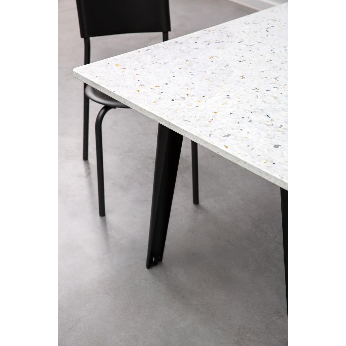 New Modern is a collection of tables and desks that’s 100% made in Europe, well thought out and produced to last. Like every project from the French item brand TIPTOE, New Modern is part of a sustainable, eco-design approach, taking care to control its impact throughout the product's life cycle. New Modern tables consist of just a few elements, all of them useful, very robust, easily separable and repairable if necessary. These tables consist of two powder-coated steel trestle legs into which are inserted two cylindrical stainless steel support beams. The top is simply screwed onto the legs. The tables are delivered flat to limit the environmental impact during storage and shipping (assembly is super-easy). The packaging is made of a minimum 80% recycled paper. The legs are made of steel, a material that’s both very strong and infinitely recyclable (it’s the most recycled material in the world). The top is available in different materials: eco-certified wood, recycled or laminate plastic. The oak plywood tops are made from wood from sustainably managed European forests (PEFC or FSC label). The top has a core made of solid, slatted fir veneered with natural oak and protected by a water-based varnish. The recycled plastic tops are made from waste: hundreds of yoghurt pots are needed to make a top. The plastic waste collected is reduced to chips and then pressed (without adding binder) to form the top. The white top is dotted with bursts of colour, echoing fragile ocean coral. The speckled pattern also evokes terrazzo, the star material of decoration. Each recycled plastic top is unique, the colour and patterns may vary, which is what makes it so charming. The different shapes and sizes of tops adapt to a wide range of contexts: dining table in a living room or kitchen, XXL table that can accommodate up to 12 people, individual desk in a private environment or even a large open space desk for several people. TIPTOE has chosen 100% European production alongside partners with excellent know-how. NEW MODERN wooden tops are made in Poland, the steel legs in Bulgaria while all the precision mechanical parts and assembly items come from family workshops in France near Chamonix. The final assembly is carried out in France in an ESAT, a medico-social establishment that works for the social and professional integration of people with disabilities.