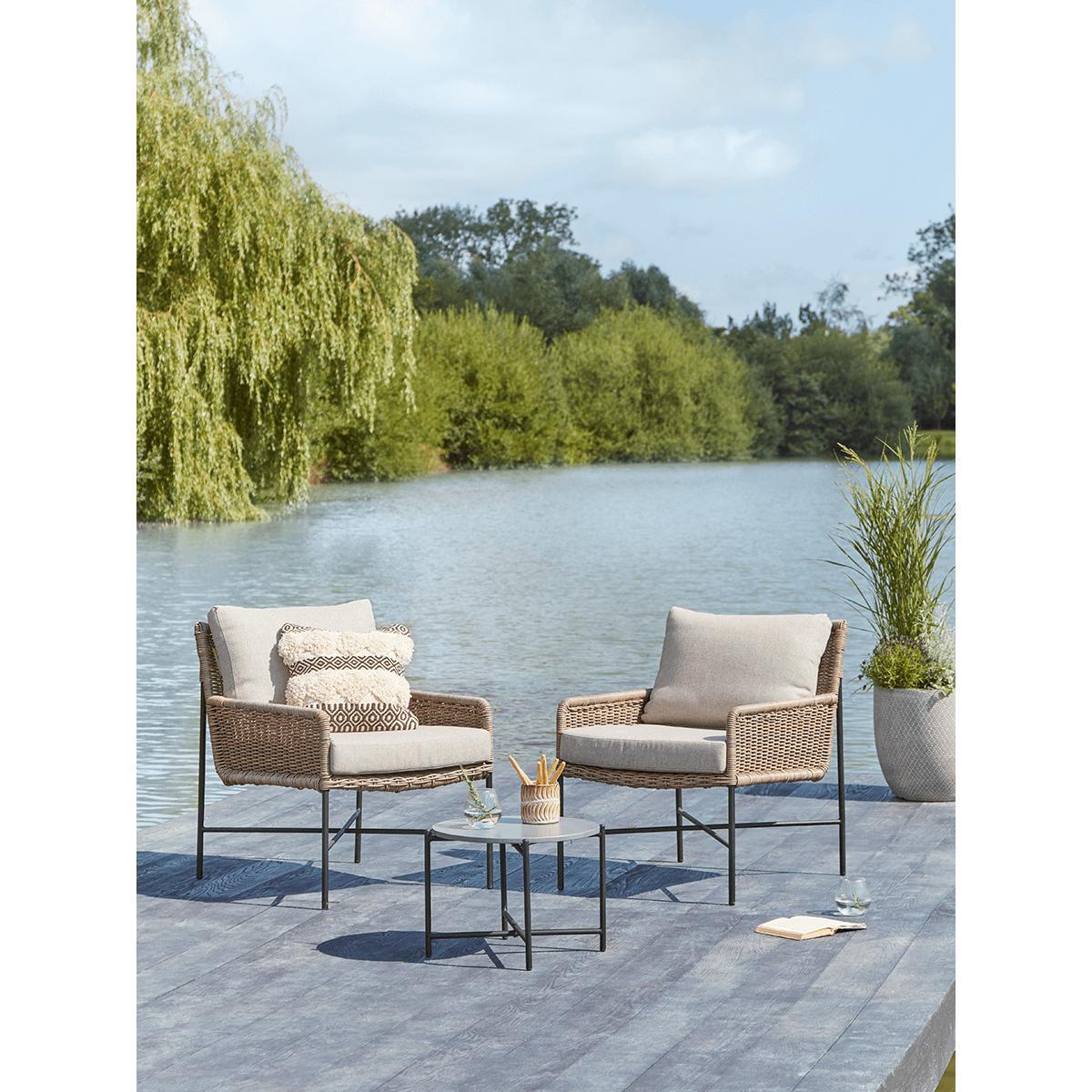 The contemporary line of our Modica Bistro set, with its simple black steel tube frame, is immediately softened by the golden faux wicker of the seats themselves. The two deep, well-proportioned armchairs have plump seat and back cushions in a light toned woven fabric. The small round table has a silver- grey top, which adds a nice contrast. This set is perfect for a small patio, or nestled within a quiet corner of a cottage garden.