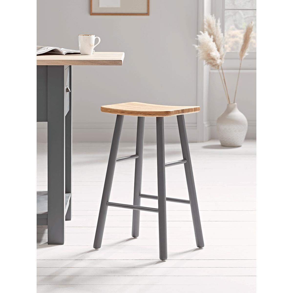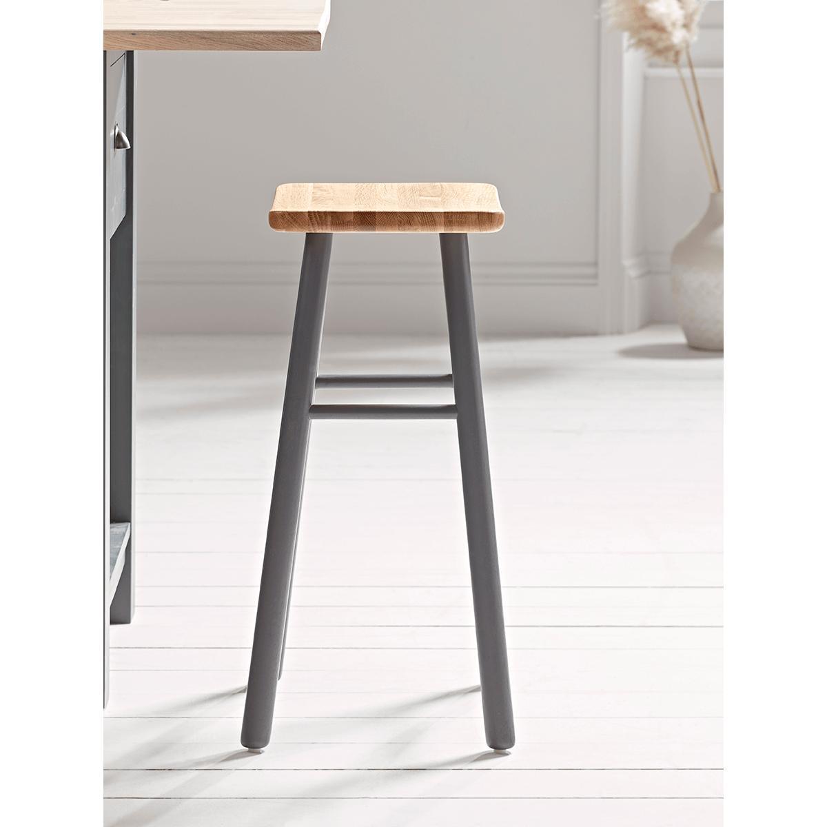 I love this charcoal oak stool for its clean lines and gently curved seat, which feels more welcoming than a flat-top design. Its neutral charcoal legs and warm oak top sit comfortably in Scandi-style kitchens, modern farmhouse schemes or pared-back, minimalist spaces. For styling, echo the dark legs with black or brass cabinet handles, add a low-profile seat pad for extra comfort and finish with a cluster of ceramics or a simple vase on the island to tie everything together.