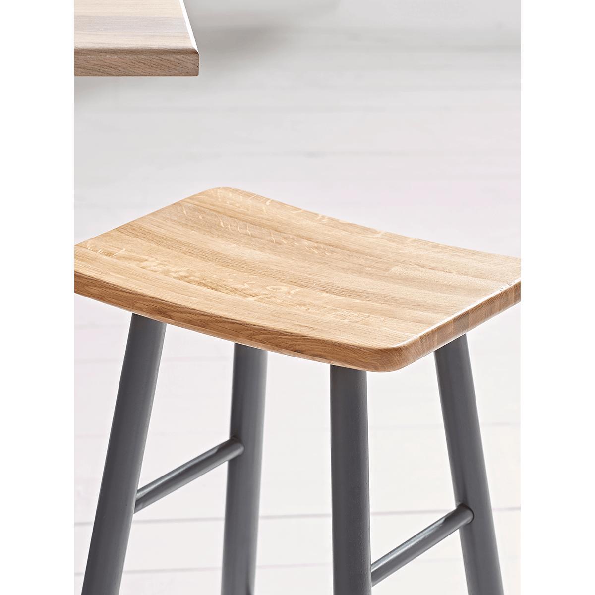 Crafted from sturdy oak with a smooth finish that allows the woods natural grain to show through on the seat and silky charcoal painted legs, our Oak Curved Topped Counter Stool is crafted for both beauty and comfort. With a rung on which to rest your feet, our robust stool is the perfect height for a breakfast bar and complements many interior styles.