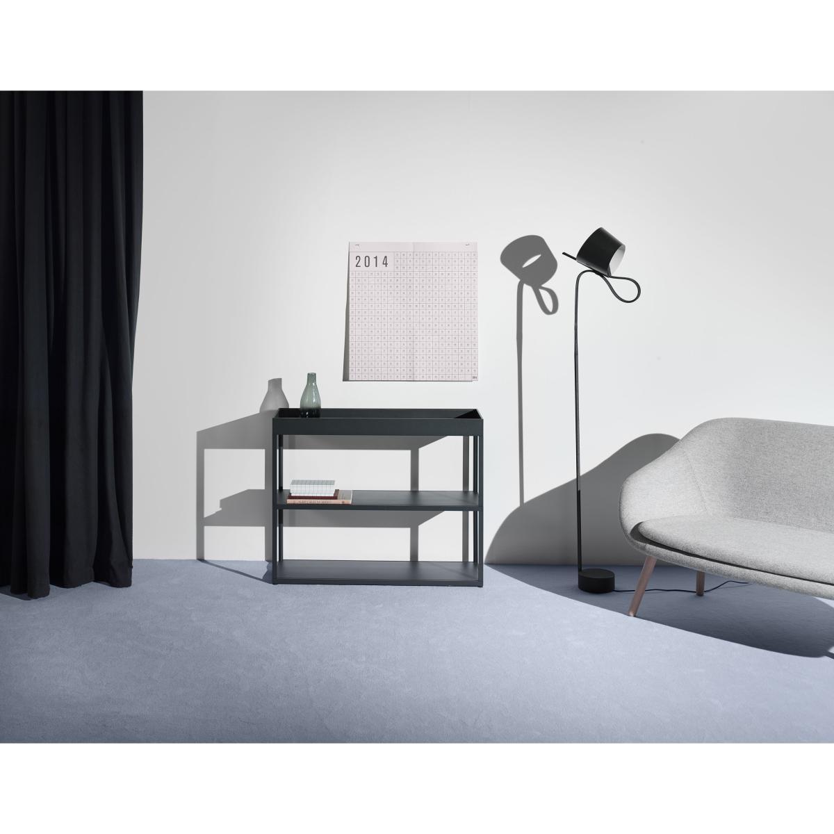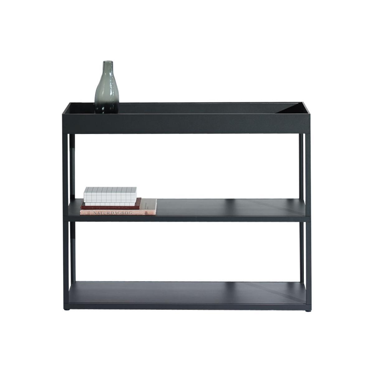 This painted aluminium shelf unit in charcoal colour, designed by Stefan Diez, consists of three shelves. The upper shelf has a high rim. Elegant and sleek, it will fit to any setting; whether in living room, kitchen, bathroom or bedroom. All units of the New Order collection are of the same depth and can be placed next and onto each other, offering a wide range of possible combinations.