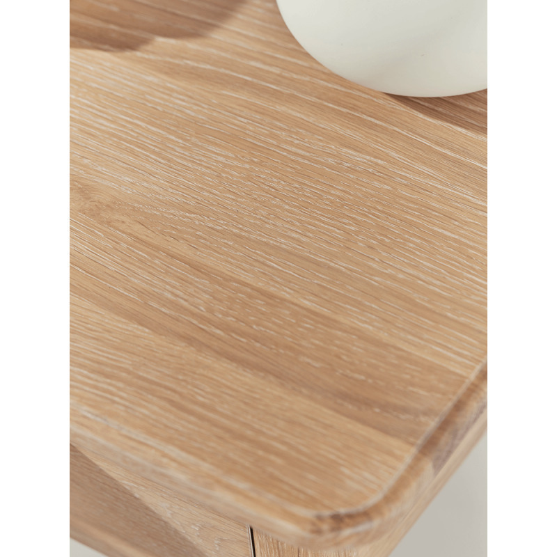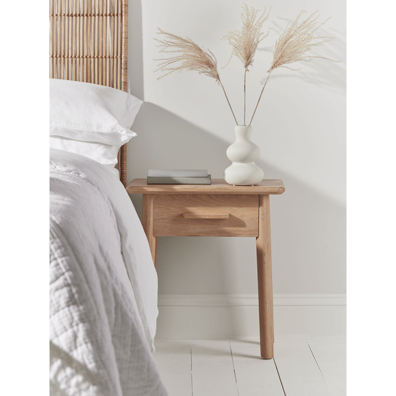 I love this bedside table for its clean, understated design and natural oak finish, which makes it highly versatile. It works beautifully in Scandi-inspired interiors, where its simplicity complements light woods and neutral palettes, but it can also soften more eclectic or modern spaces. Practical styling tips include keeping the surface minimal-perhaps a small lamp, a couple of favourite books, or a decorative tray-to maintain its sleek look. Its compact size makes it perfect for smaller bedrooms or tight spaces, while the drawer offers handy storage for bedtime essentials. Overall, it’s a functional and stylish addition that adds warmth without cluttering the room.