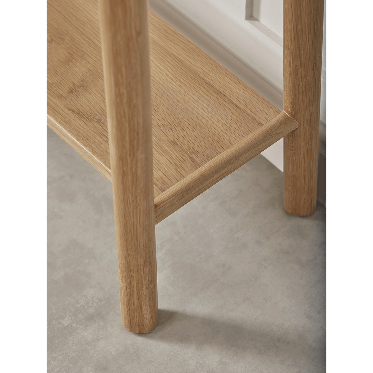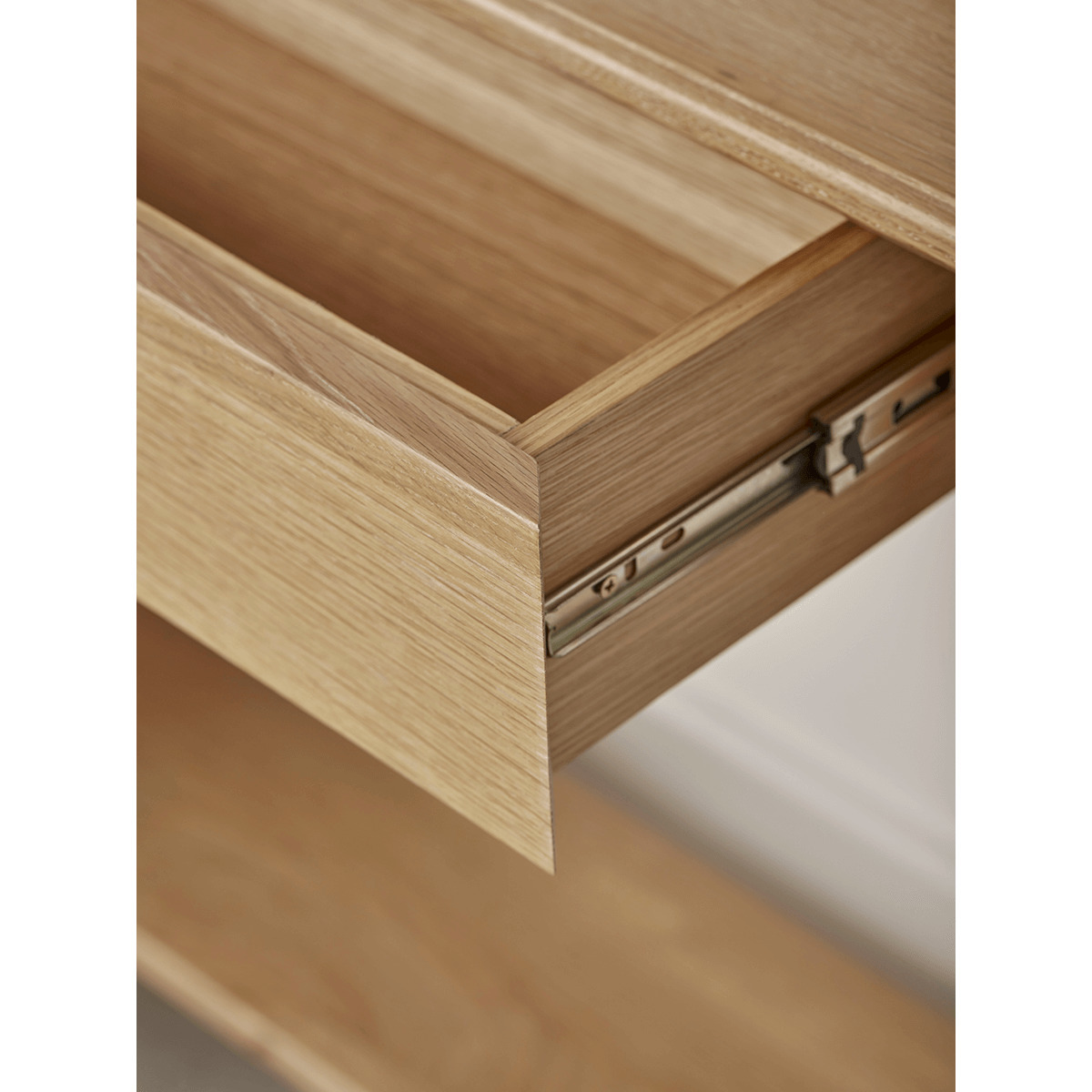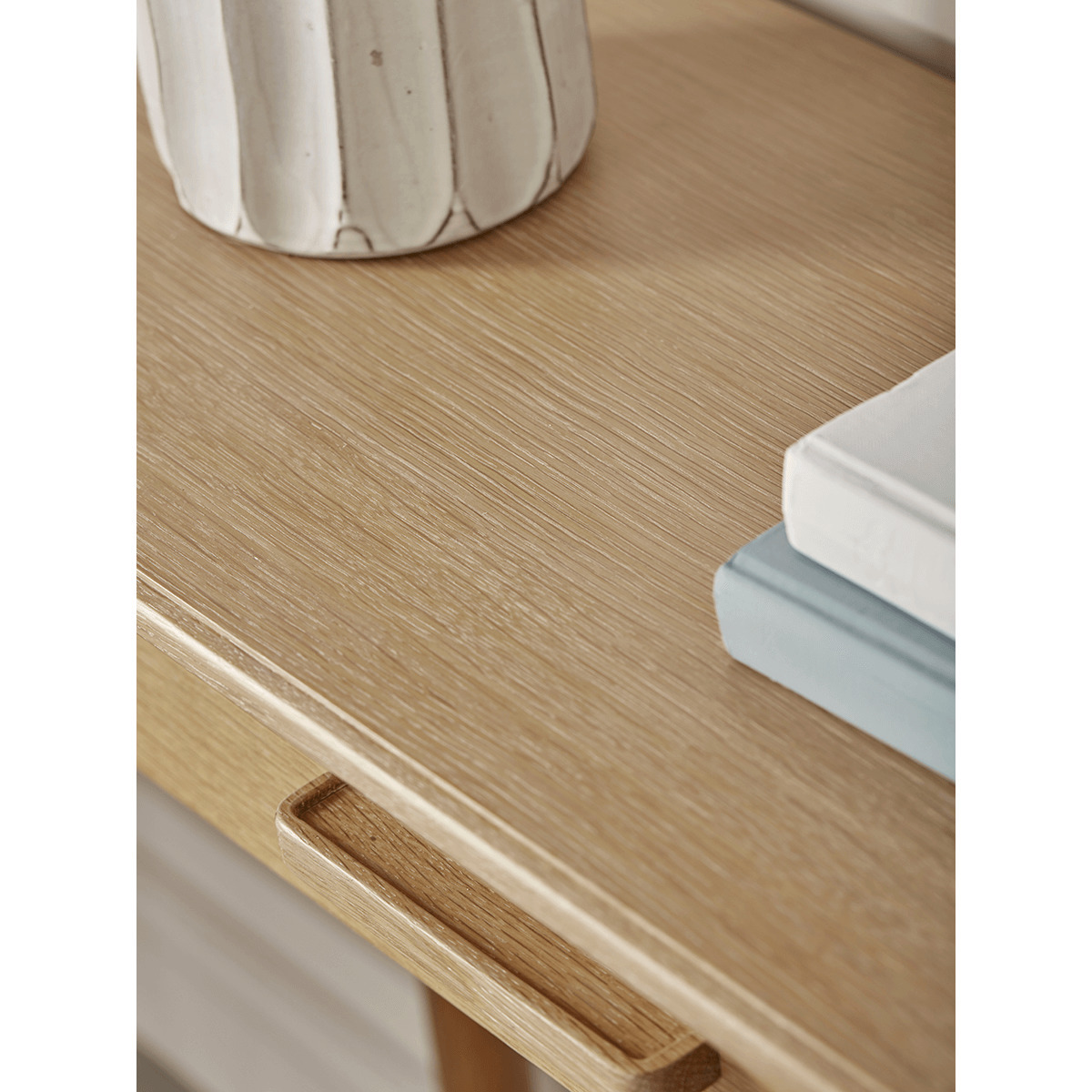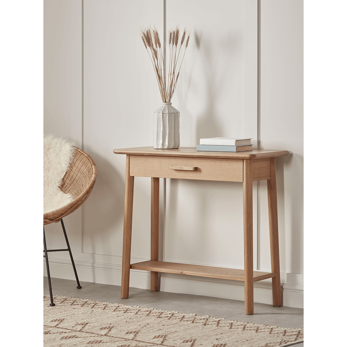 With a simple, clean profile, our Scandinavian-inspired Oslo Oak Storage Console Table features a blonde oak surface with visible natural wood grain. A generous drawer with a lovely oak cup handle, slender smooth legs, and a versatile lower shelf complete a design that is flawlessly finished and wonderfully tactile. Discover more of our. Oslo Oak. Furniture range.