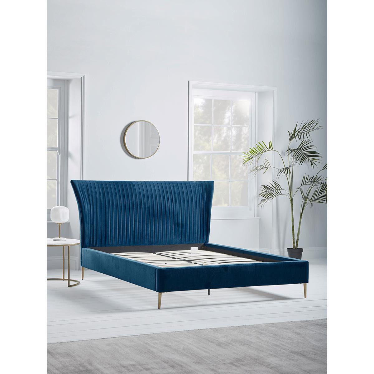NEW Pleated Velvet Super King Bed - Deep Blue