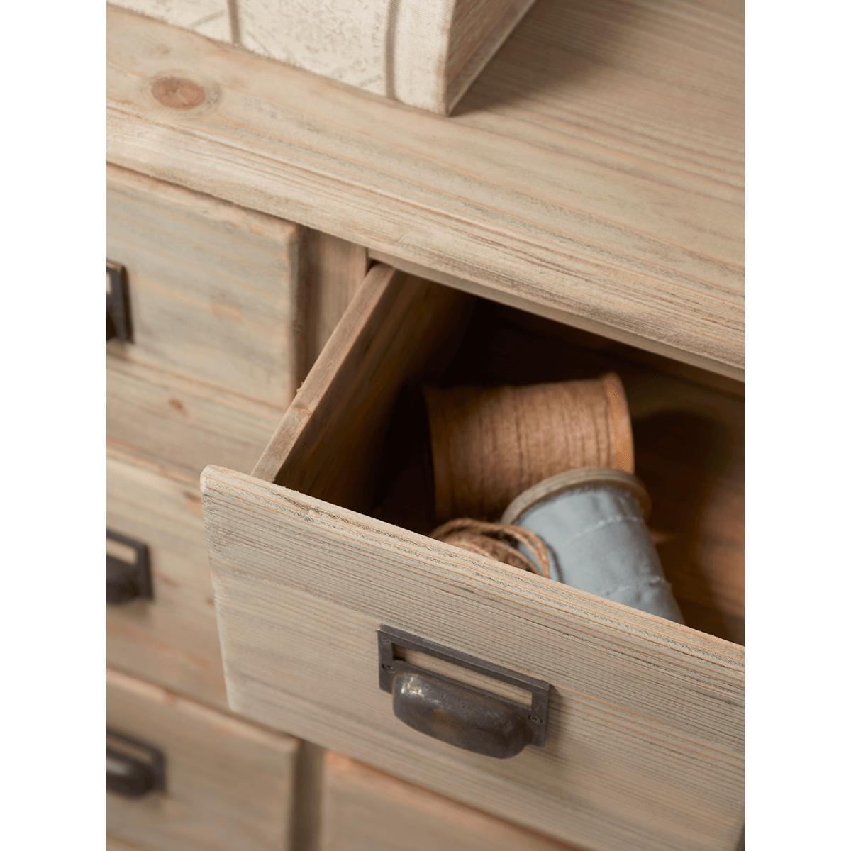 I love this wooden drawer unit for its authentic reclaimed finish and practical storage - the many small drawers are ideal for stashing stationery, crafting bits or everyday essentials, making it as useful in a hallway console or home office as it is in a living room. Its neutral tones and weathered texture suit industrial, farmhouse or coastal schemes; style with pared-back artwork above, a ceramic table lamp and a trailing plant on one side, and add small brass or leather drawer labels for a finishing touch.