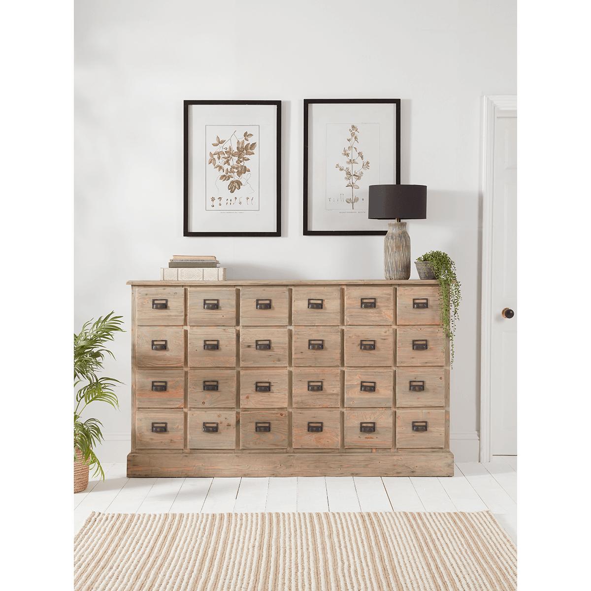 Spice up your storage with our Reclaimed Wood Chest. With 24 drawers there’s ample space to store a wealth of small objects - perfect for crafters or the person for whom one man drawer is never enough. The super efficient could even take the time to label their drawers as the brass handles have space in them for little cards. The rustic good looks of the reclaimed pine will add character and interest to any home.