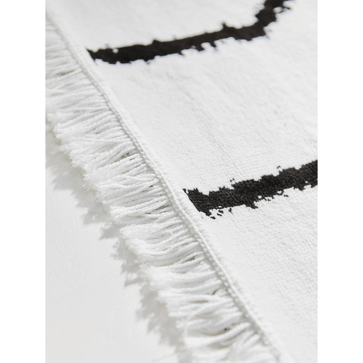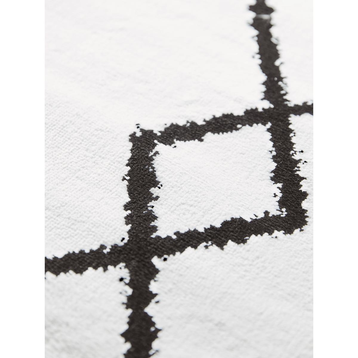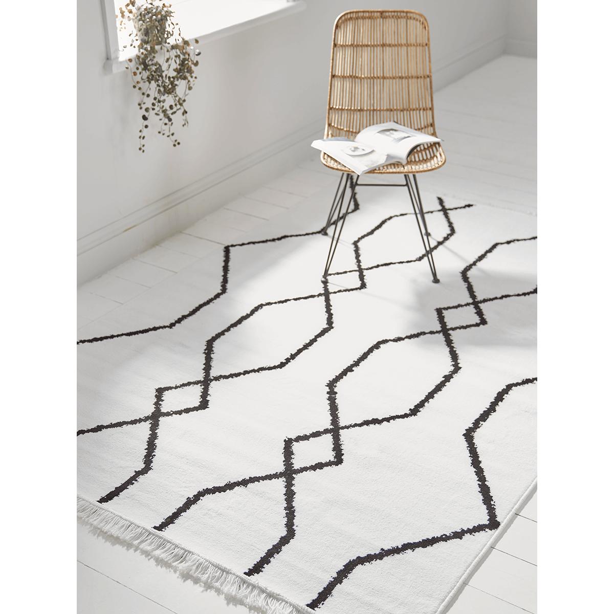 Striking black geometric patterns add interest to this monochrome rug. In soft ivory, with neat self-coloured fringes to the shorter edges, this rug will adapt to a number of settings, pulling together your scheme for a cohesive look.