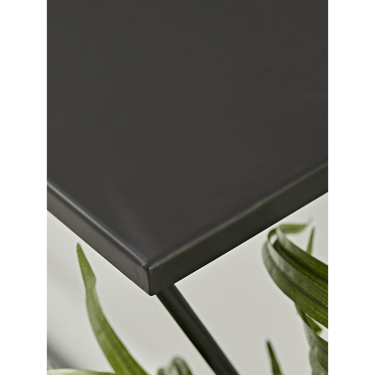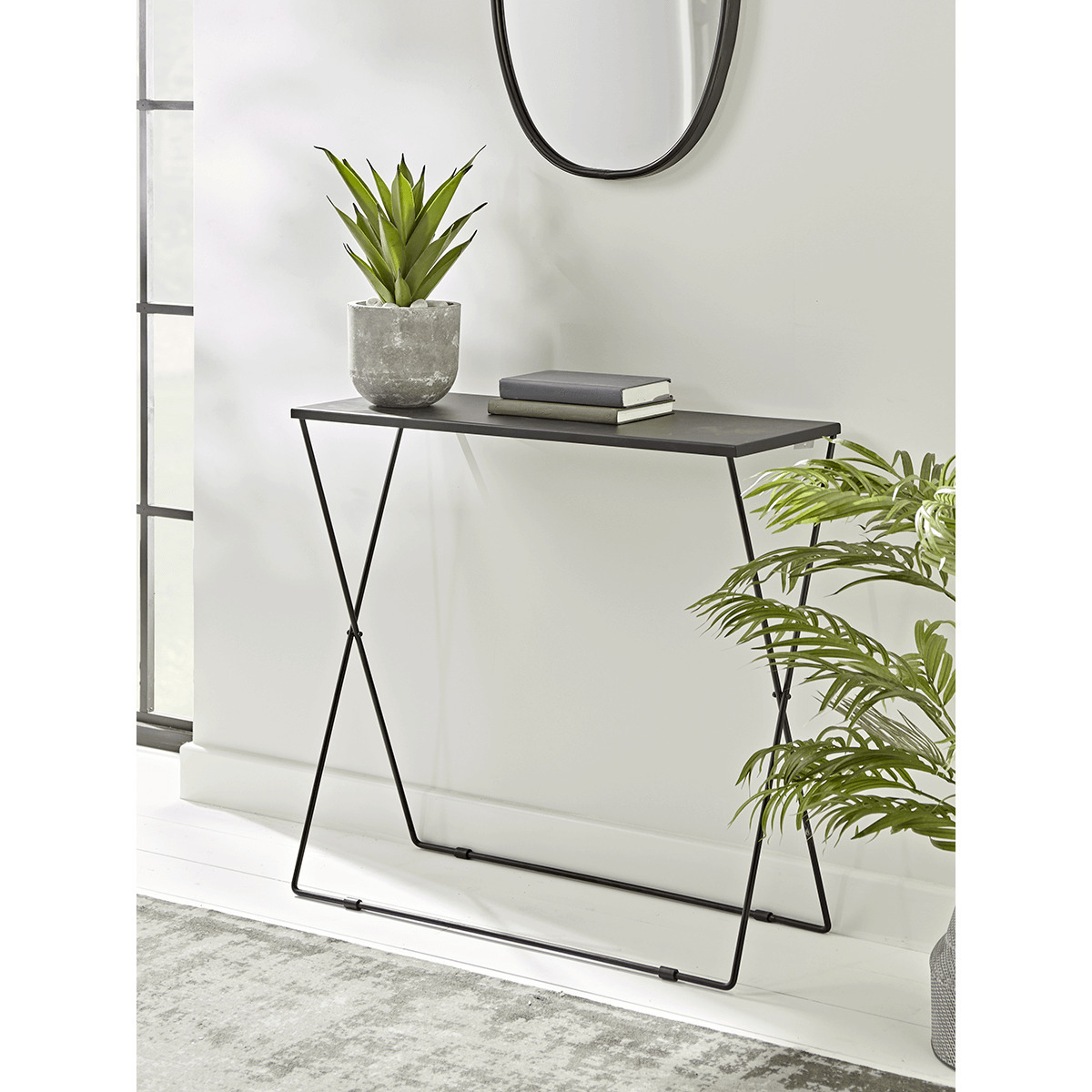 Made from black iron with a striking slender frame, our console table will make a statement in any hallway or living area. A folding frame and slim size make it a versatile table, a tidy surface for a curated display of decorative pieces.