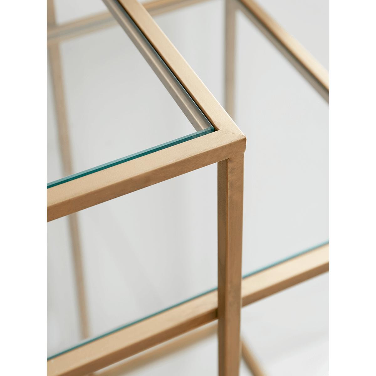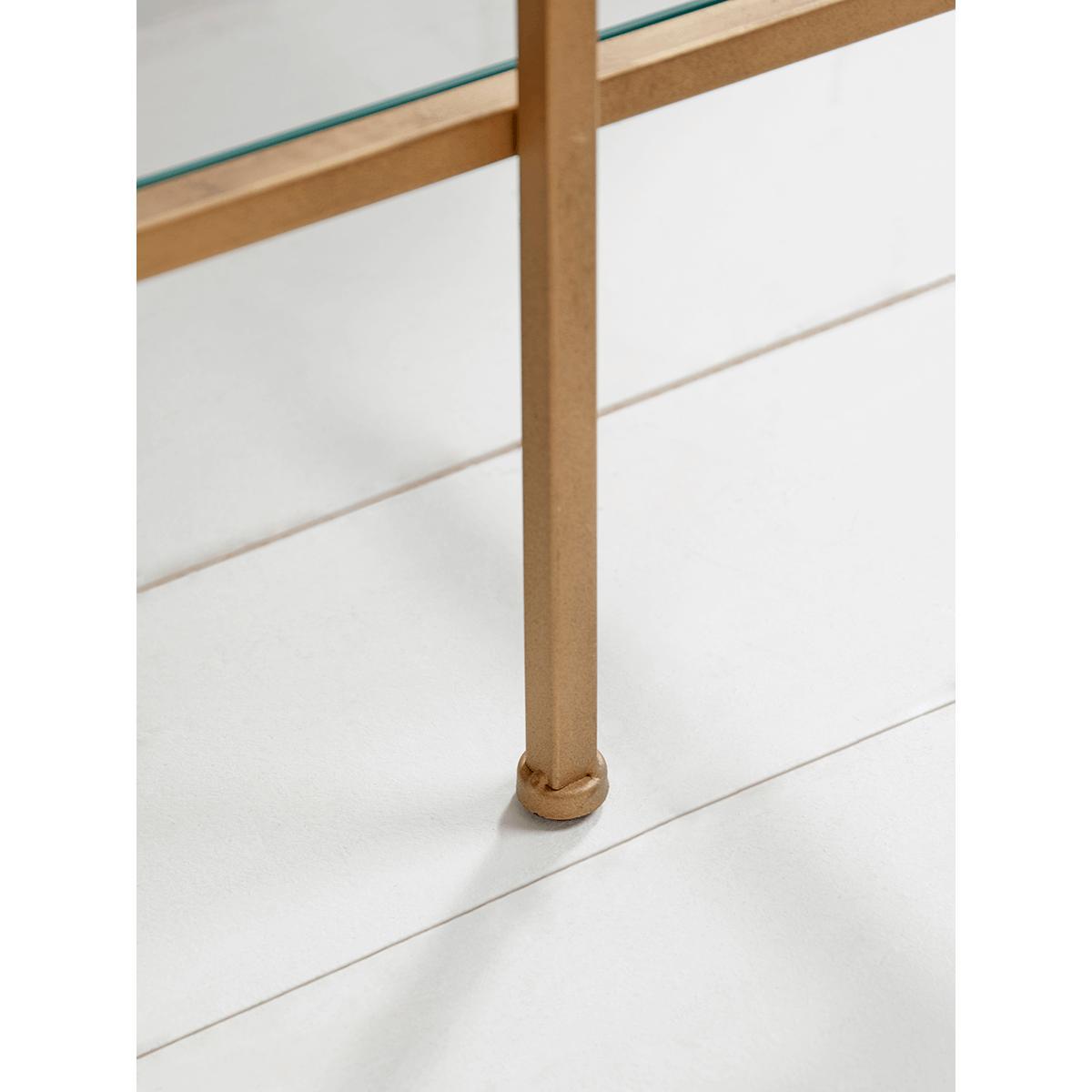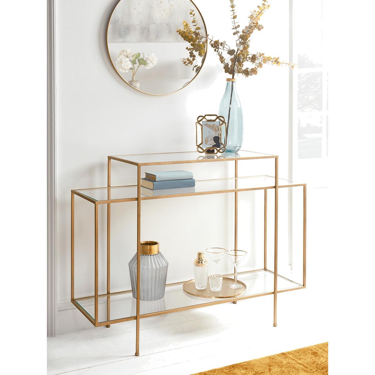 Make the most of your space and transform your hallway with our Soft Gold Glass Console Table. Inspired by the deco designs of the 1920s, this statement piece features a distinctive silhouette, sturdy iron frame and three generous glass shelves on which to display favourite. Table lamps. ,. Vases. And ornaments.