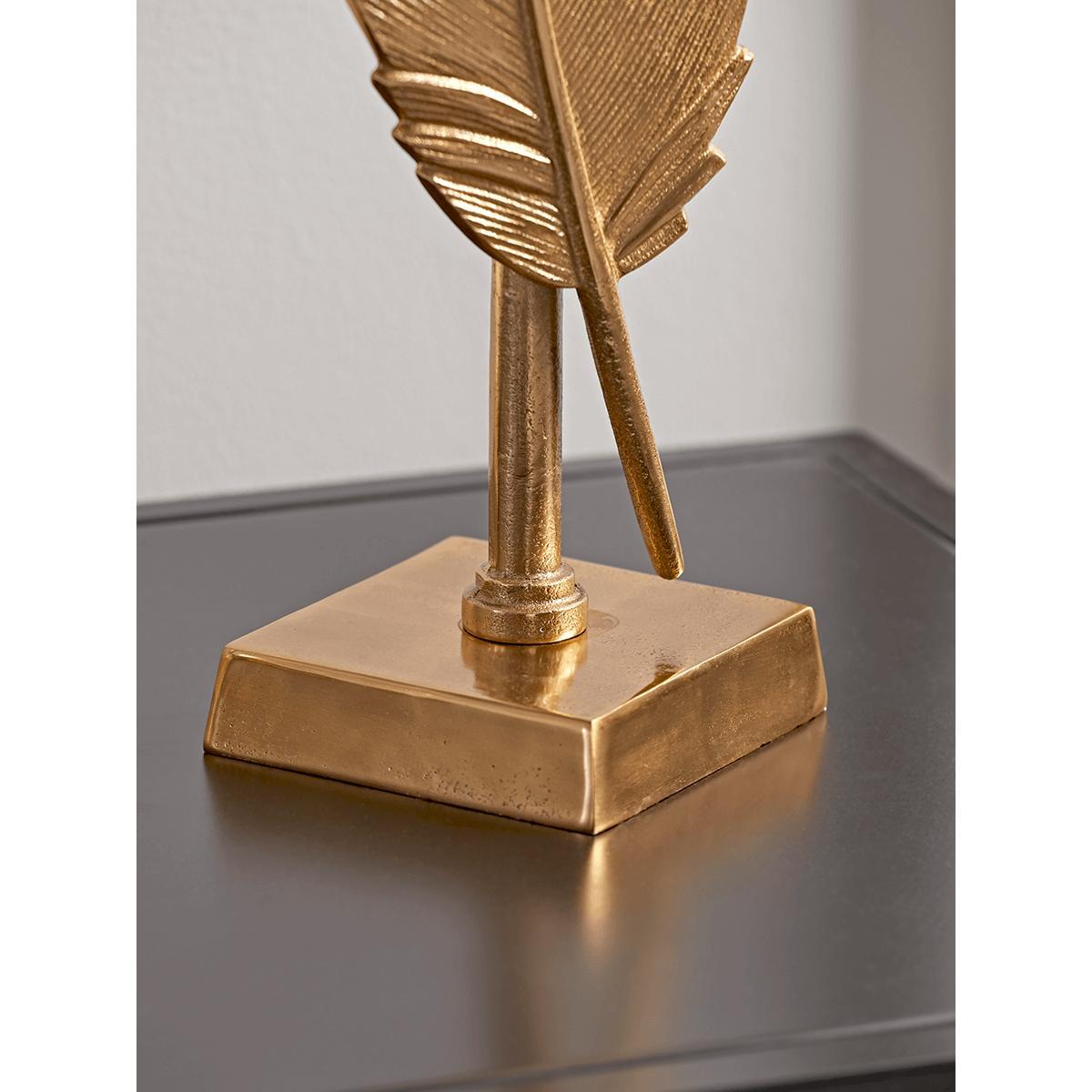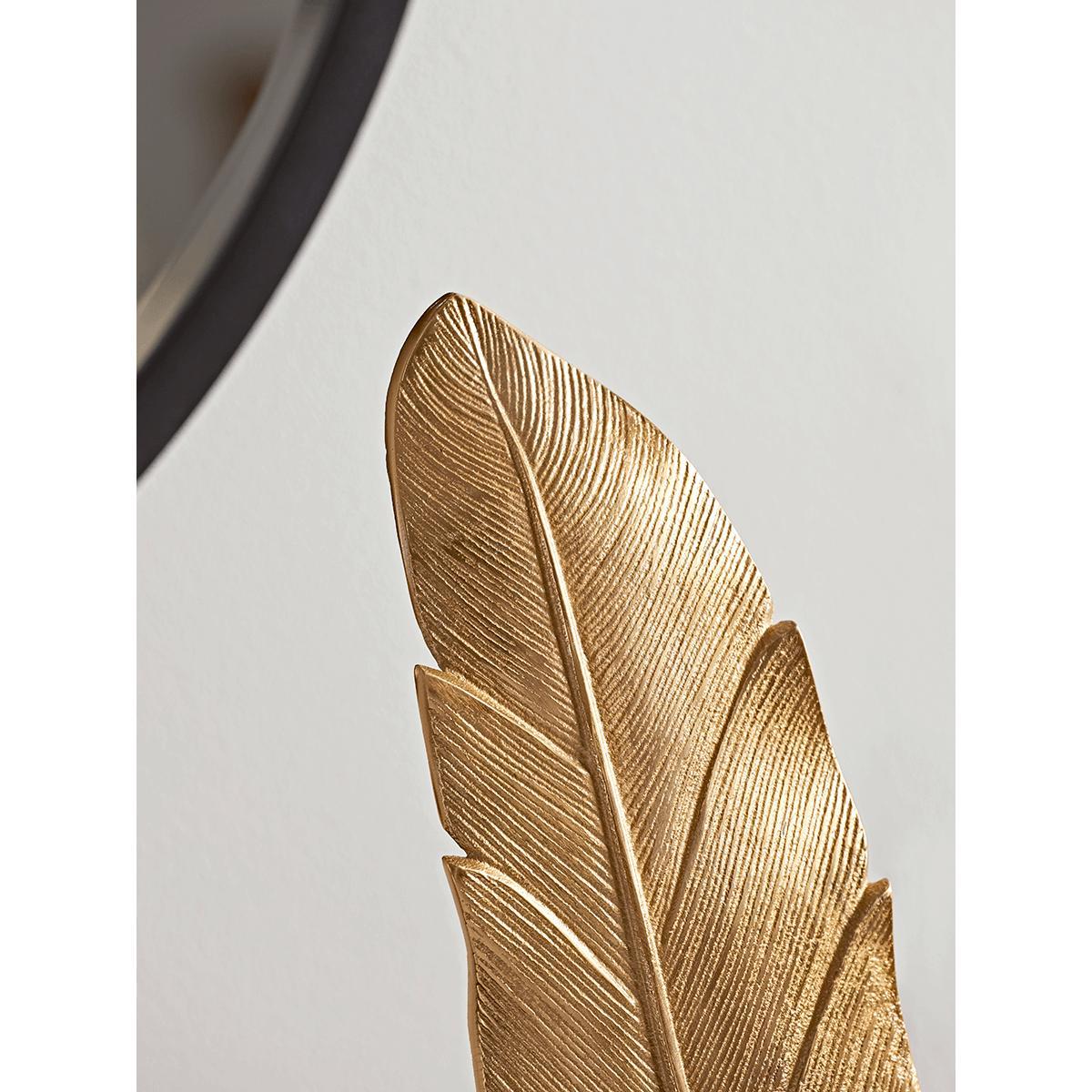 Accent your living space with touches of glamour and decorative design such as our intricate Soft Gold Standing Feather and create an overall luxurious look that draws the eye and inspires the mind. Made from aluminium with a golden finish, it’s perfect for a shelf or mantelpiece. A coordinating. Soft Gold Standing Leaf. Is also available.