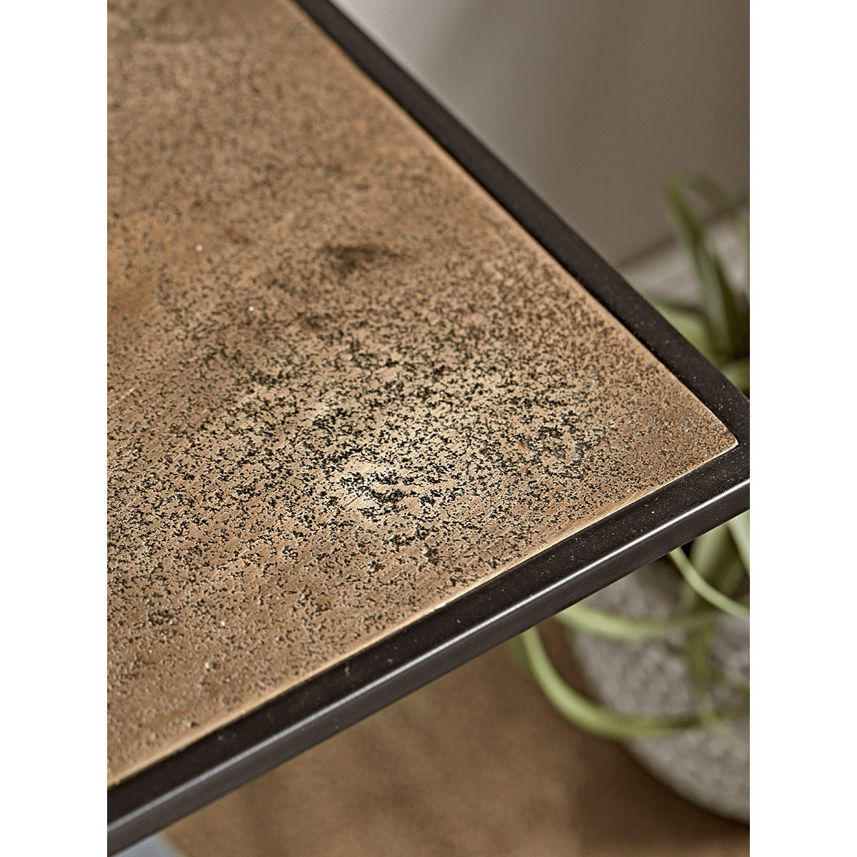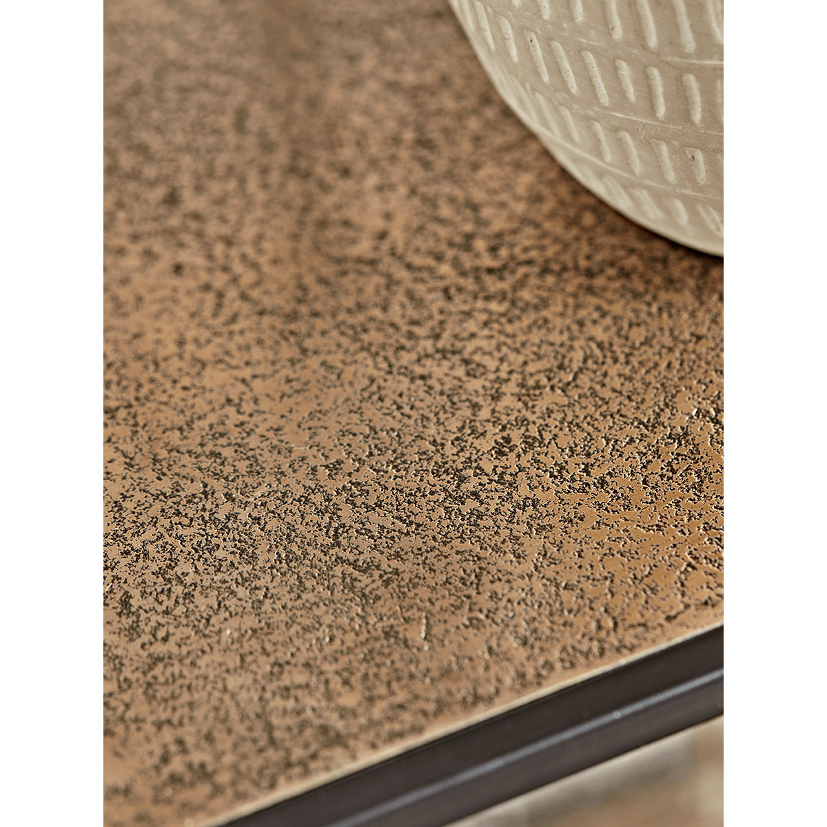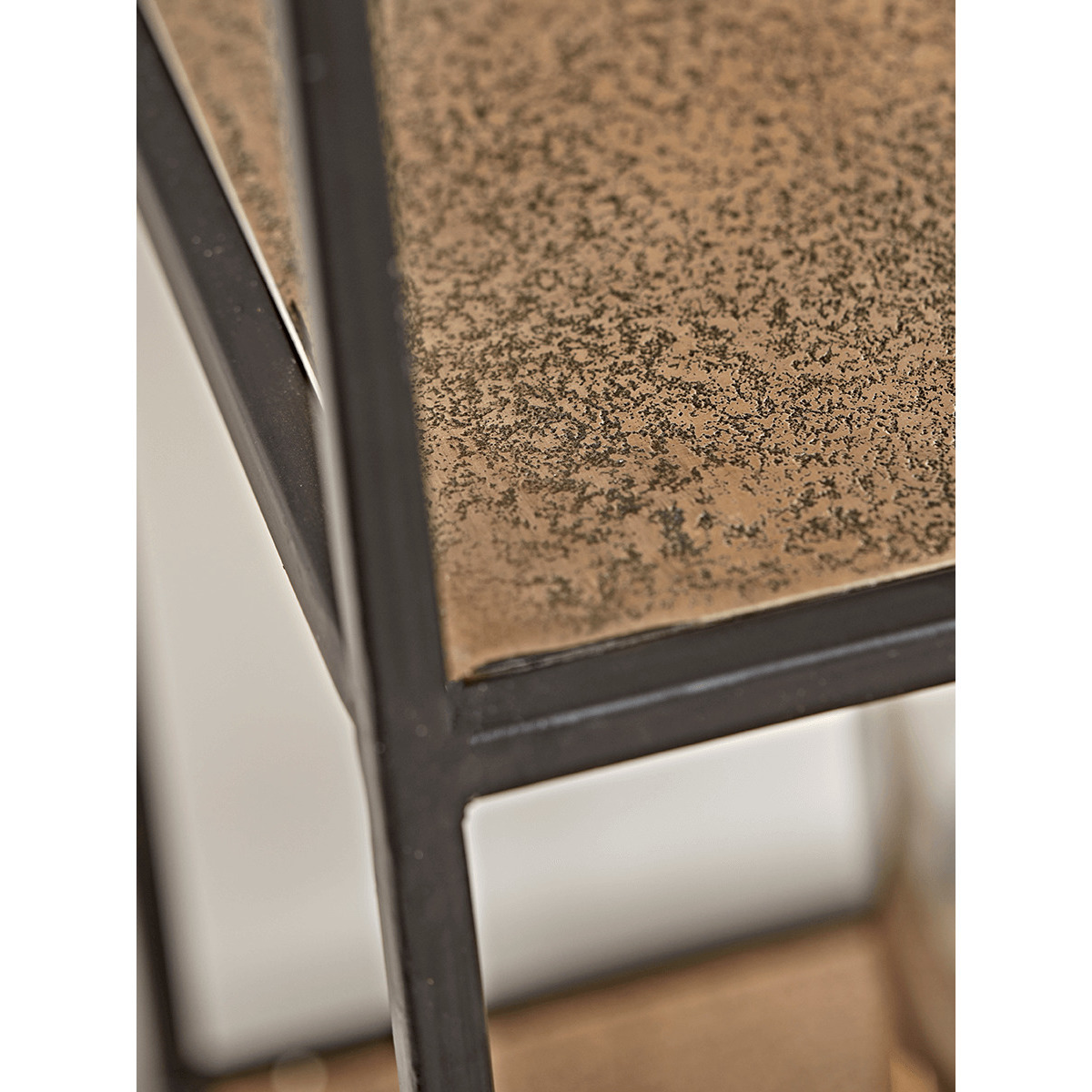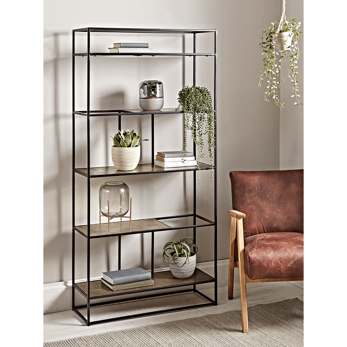 A distinctive shelf unit, of industrial tone, one that stands out by design with a slender metal stepped framework accented with gold. Five generous shelves are set within the frame, and have a feature pitted gold finish, perfect platforms on which to display your favourite decorative objet, books, and feature lighting. A real highlight in the home, a statement piece to set the mood of any room.