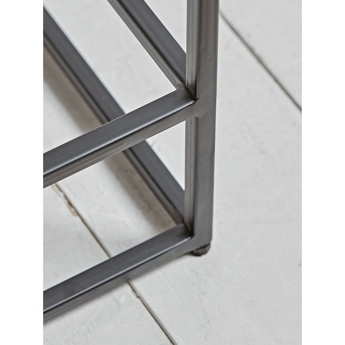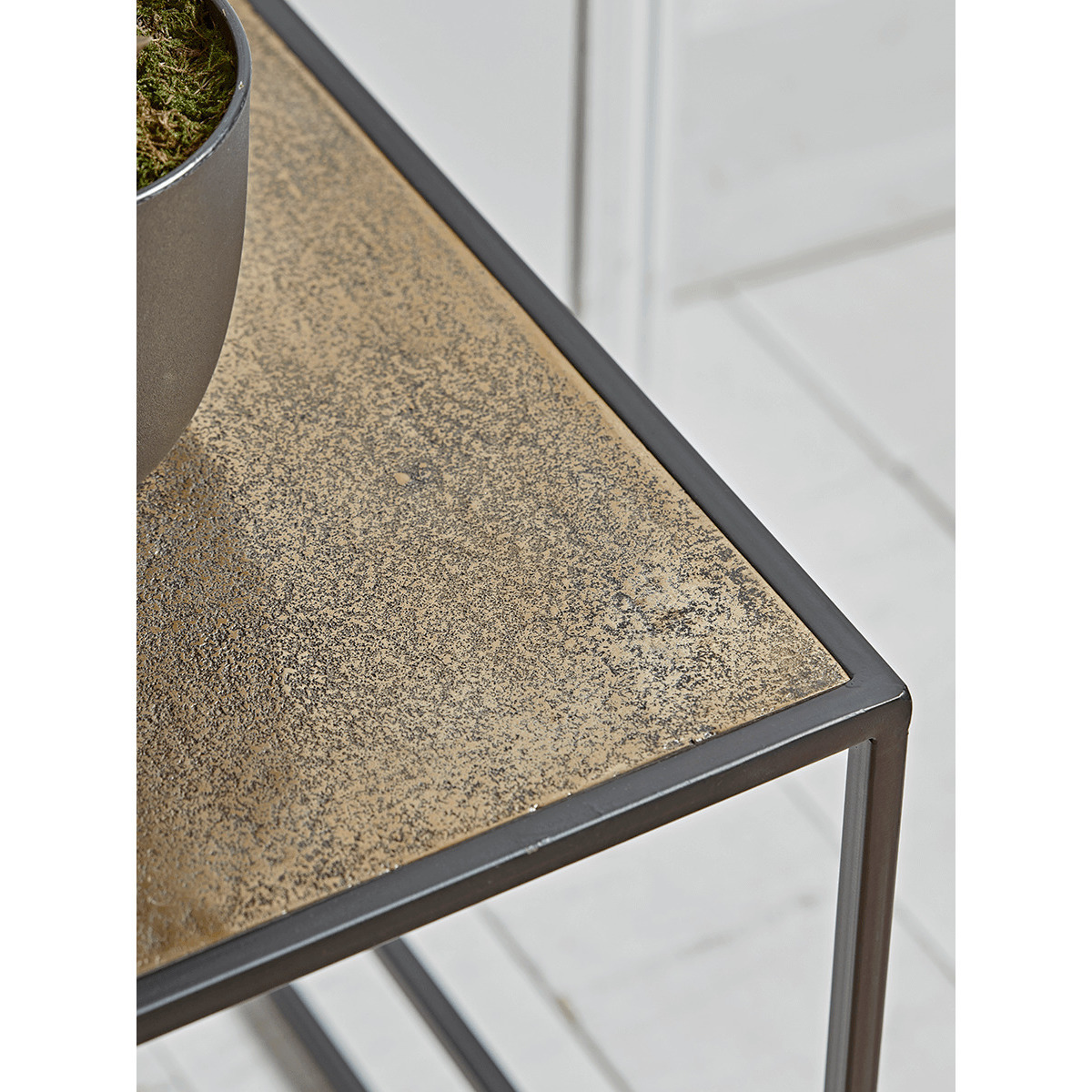 A distinctive side table, of industrial tone, and one that stands out by design with a slender metal stepped framework accented with gold. A feature pitted gold finish table top is the perfect platform for a table lamp, to rest your book, or on which to place a decorative piece.