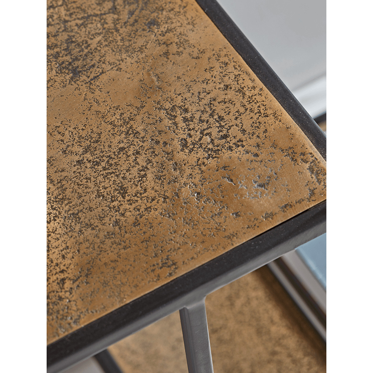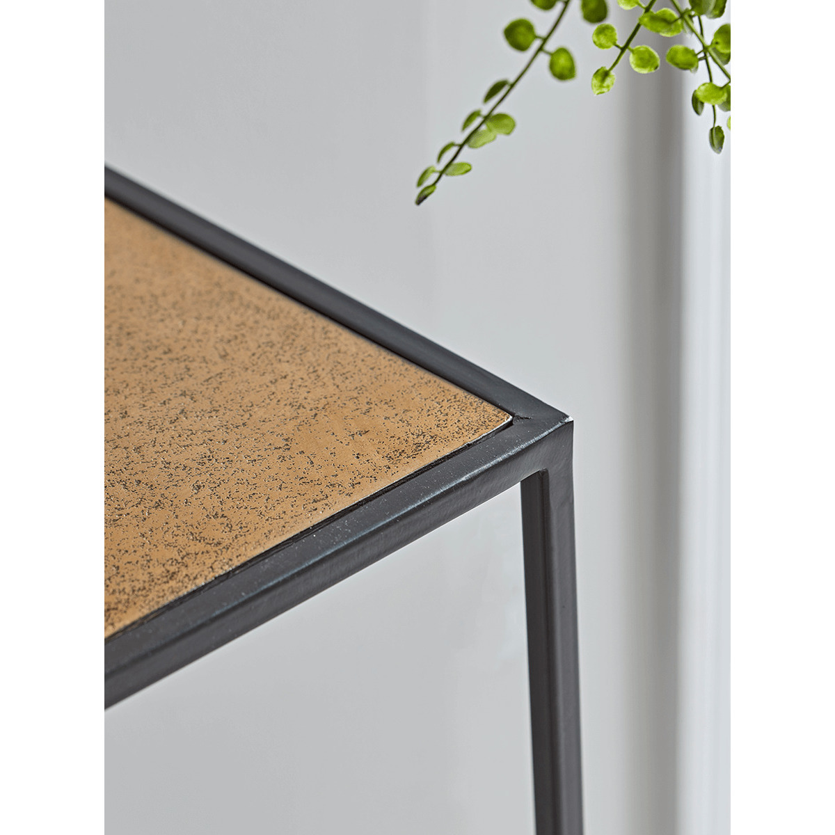 A distinctive storage console, of industrial tone, one that stands out by design with a slender metal stepped framework accented with gold. Alongside a generous surface are three lower shelves set within the frame, all with a feature pitted gold finish, perfect platforms on which to display your favourite decorative objet, books, and feature lighting. A real highlight in the home, a statement piece to set the mood of any room.