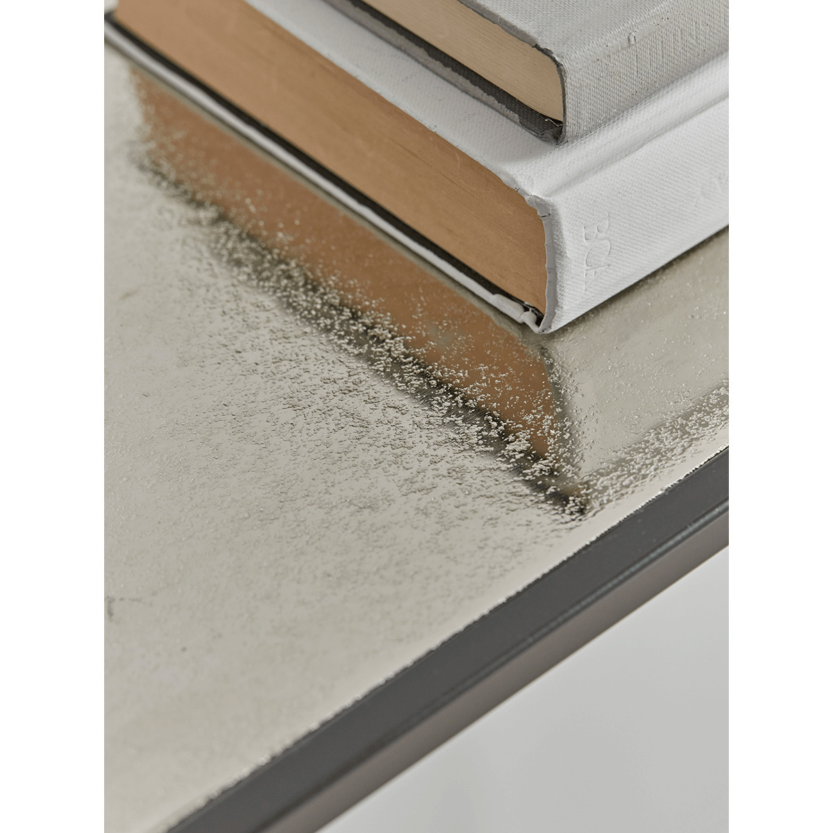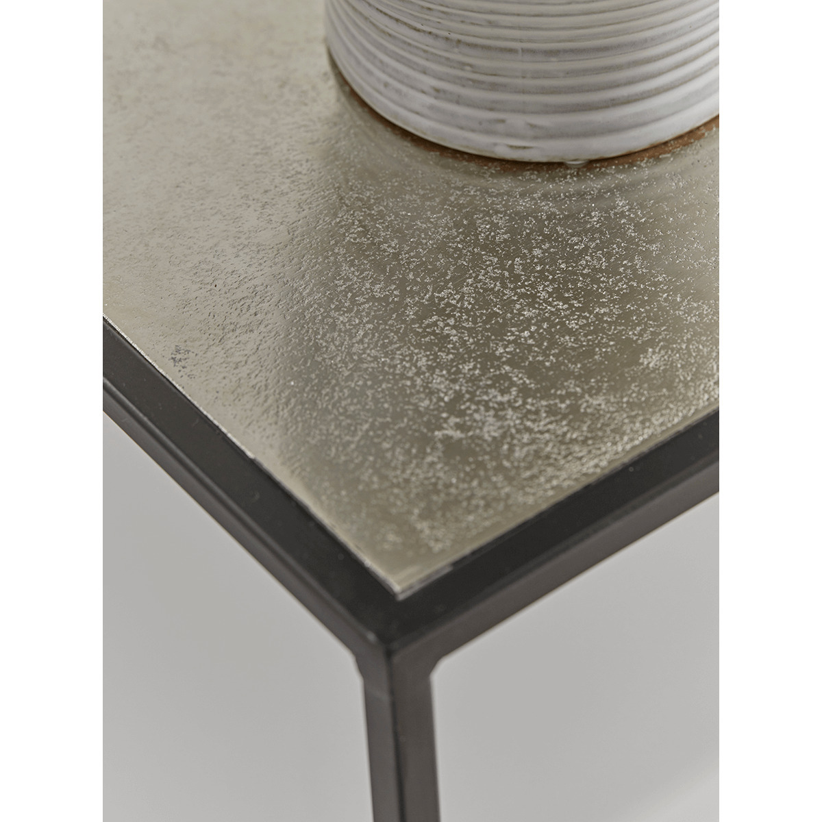 A striking piece, that will set the tone in any space. A feature slender metal frame topped with a pitted silver-finished surface creates a refined look, both luxe and elegant.