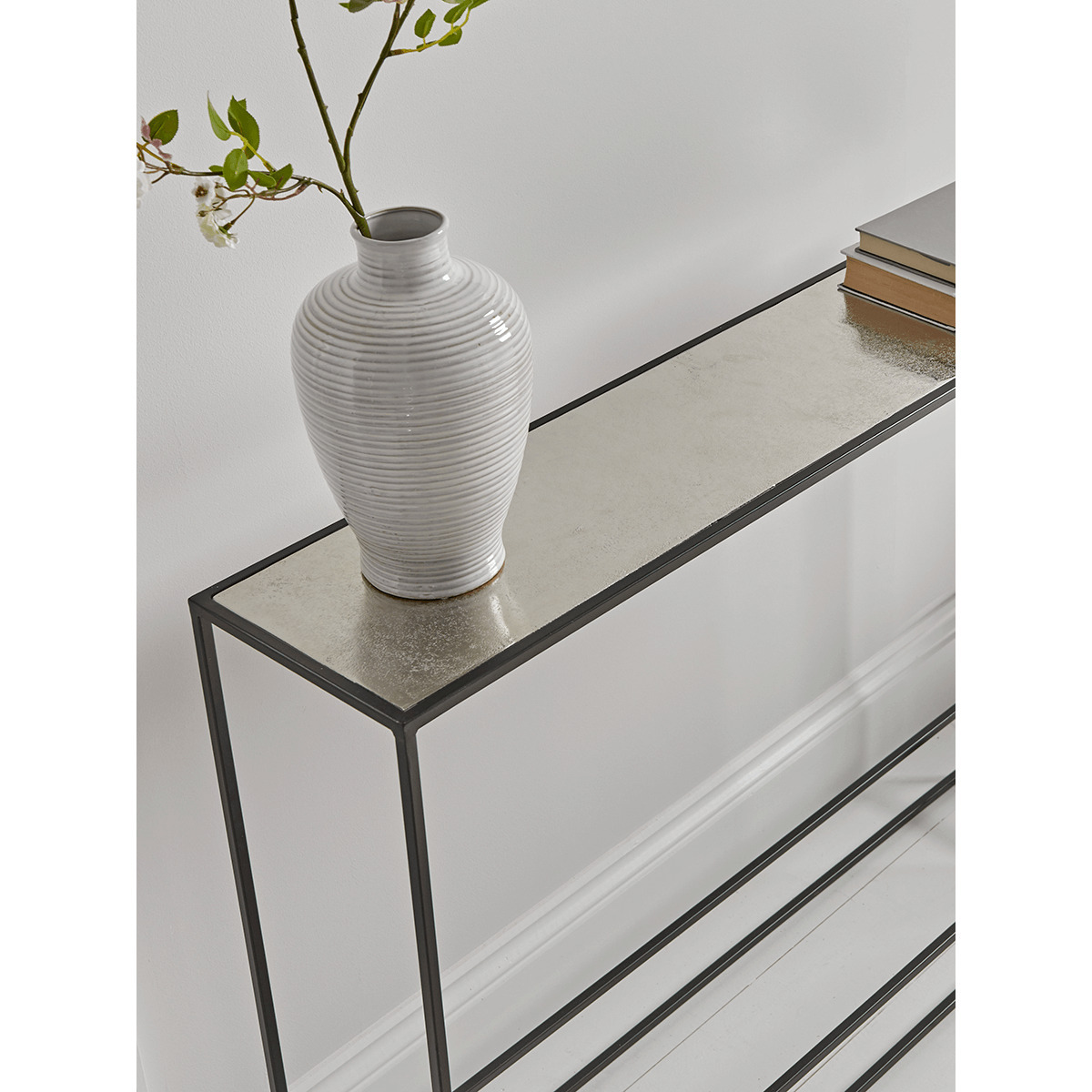 I love the textured topped metal console because it offers a sleek, contemporary look with a touch of industrial charm thanks to its burnished silver finish. It's a versatile piece that works well in both minimalist and modern interiors, making it perfect for hallway entrances, living rooms, or even as a stylish bedside table. For styling, consider keeping the surface minimal-perhaps a statement vase or a couple of stacked books-and pair it with other metallic accents to create a cohesive look. Practical tips include using it to display artwork, flowers, or decorative objects, but it'll also serve as a handy surface for keys or mail, making it both beautiful and functional.