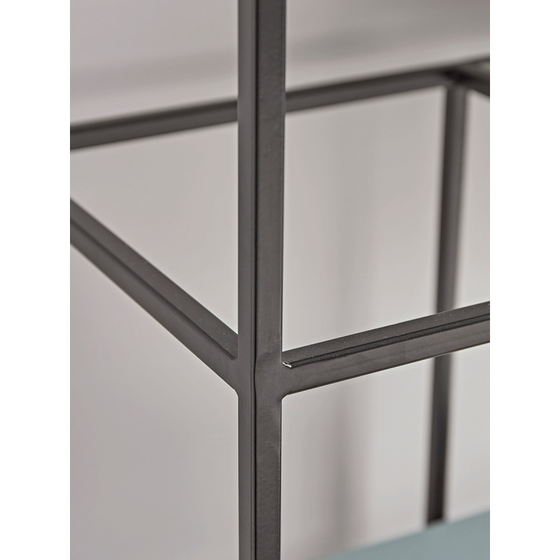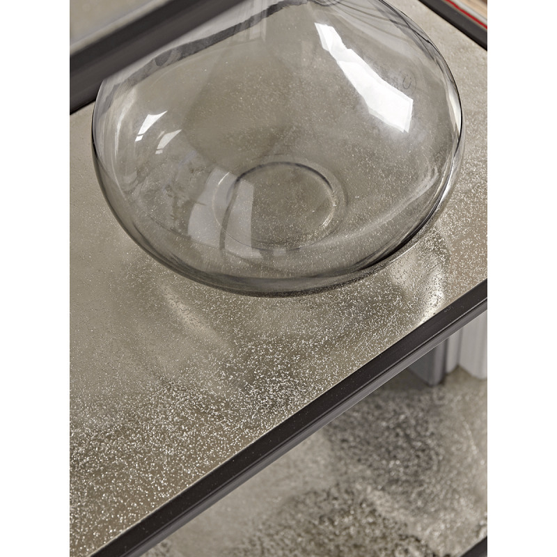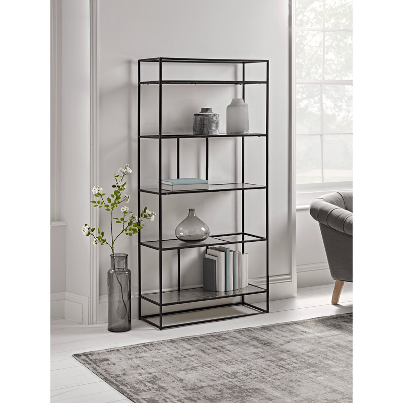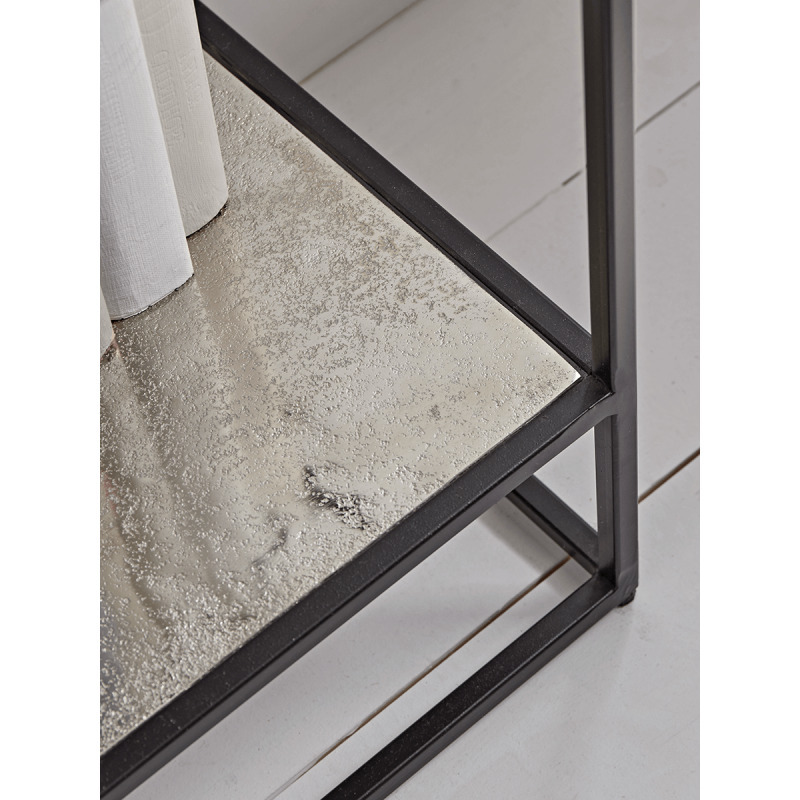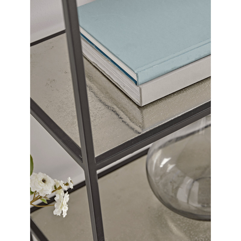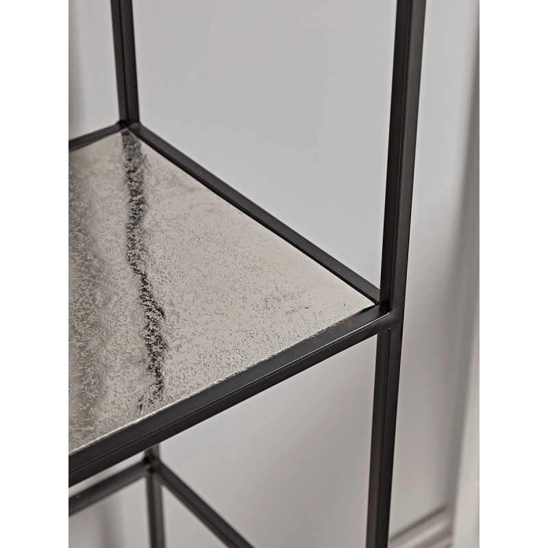 A distinctive shelf unit, of industrial tone, one that stands out by design with a slender metal stepped framework accented with silver. Five generous shelves are set within the frame, and have a feature pitted silver finish, perfect platforms on which to display your favourite decorative objects, books, and feature lighting. A real highlight in the home, a statement piece to set the mood of any room.