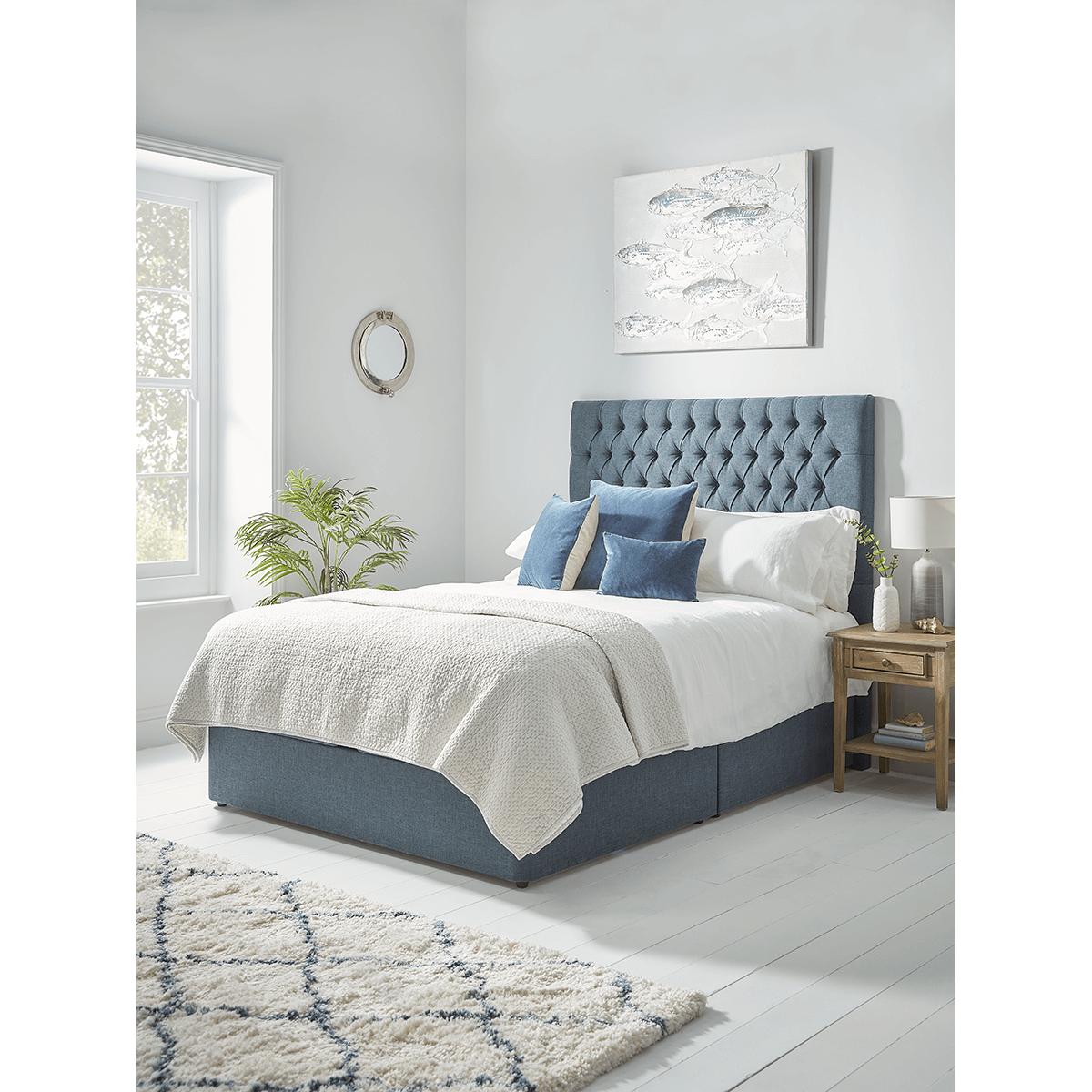 Enjoy some boutique hotel style luxury in your bedroom with this impressive statement headboard. With its dramatic proportions, this bed head allows for sumptuously high pillow stacking without detracting from the beauty of its deeply buttoned upholstery. Handmade in the UK our headboard is available in three size – double, kingsize and super king and is designed to complement our. Lina Storage Bed. Seen here in a timeless Navy, this headboard is also available in. Grey.