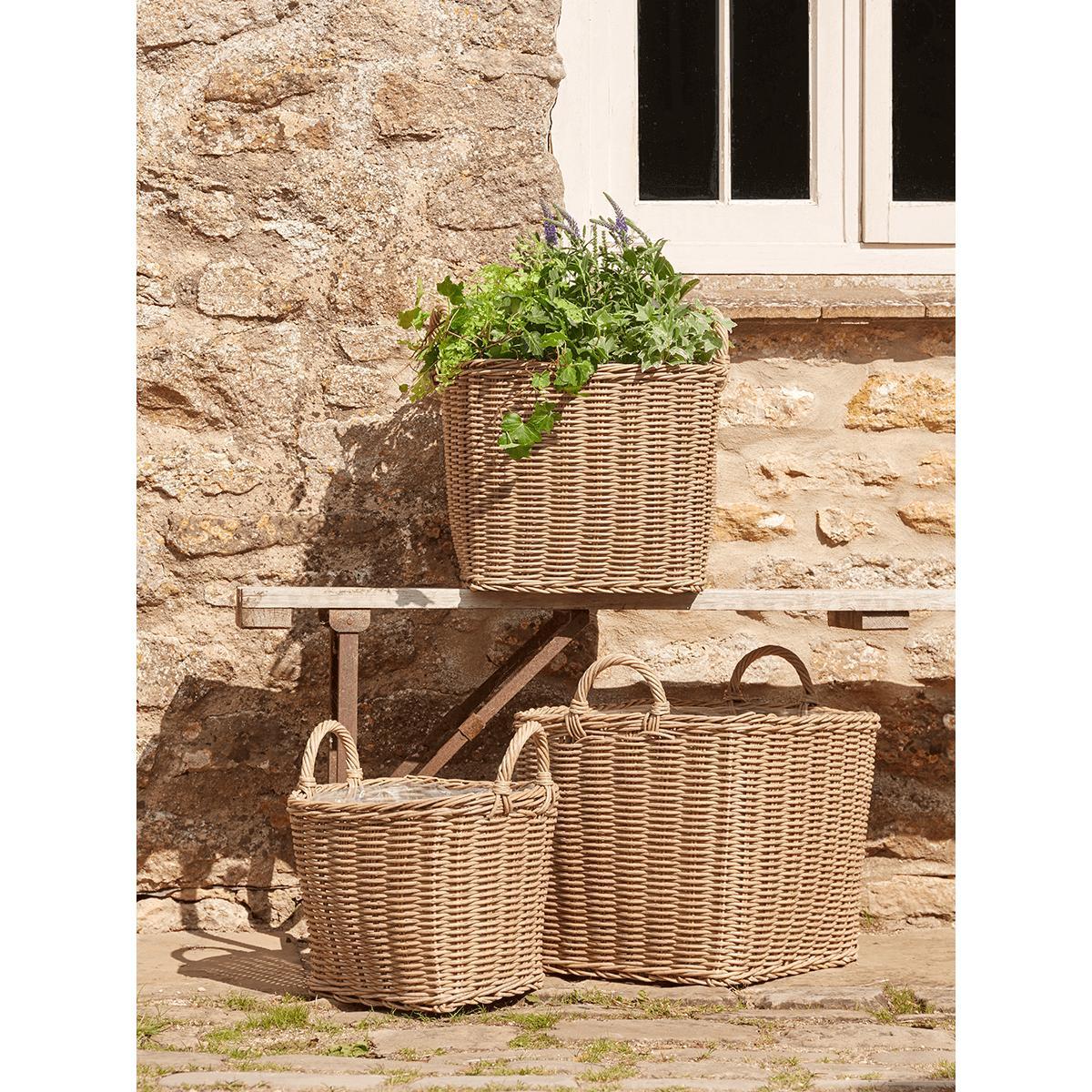 Offering a softer image than some of our planters, this set of three rectangular faux rattan planters will bring a cosy rustic feel to your outdoor space - perfect for cottage gardens or where a homelier look is desired. With a classic weave and the tone of natural wicker, these basket planters have useful carrying handles and plastic linings. Our set includes one large, one medium and one small planter.