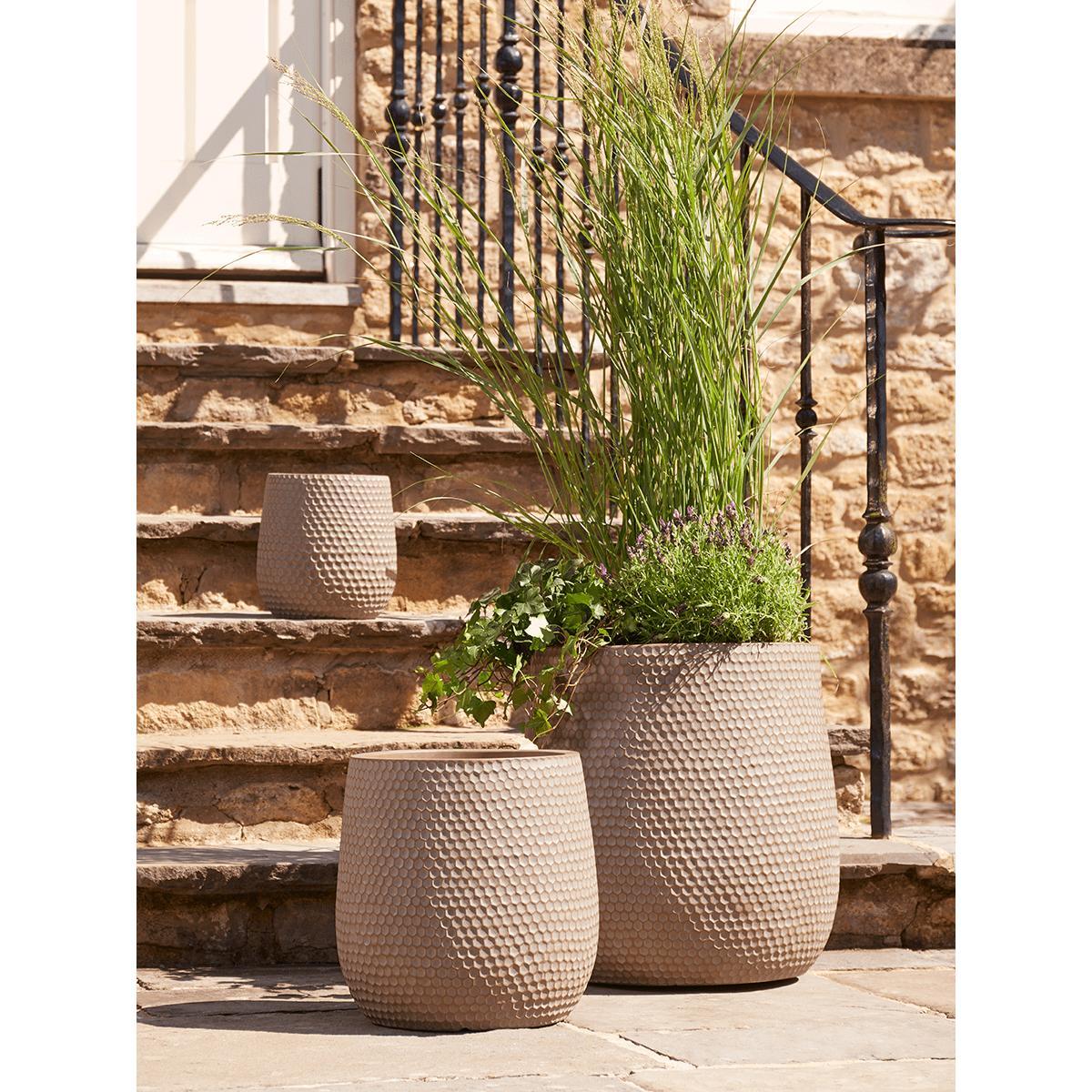 With their tactile honeycomb surface detail, this trio of planters will make an attractive addition to any outdoor space. Made from lightweight fibre clay, the set includes one small, one medium and one large planter. They will look stunning grouped together and filled with spring and summer planting.