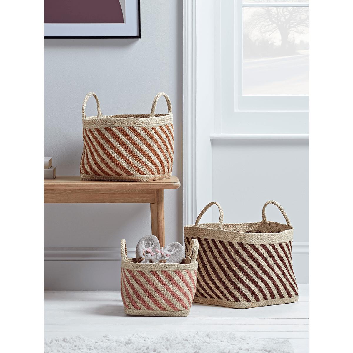 Presented in a selection of warm blush and caramel hues, our set of Three Striped Storage Baskets are ideal for stowing away household clutter while maintaining a fun, stylish aesthetic.